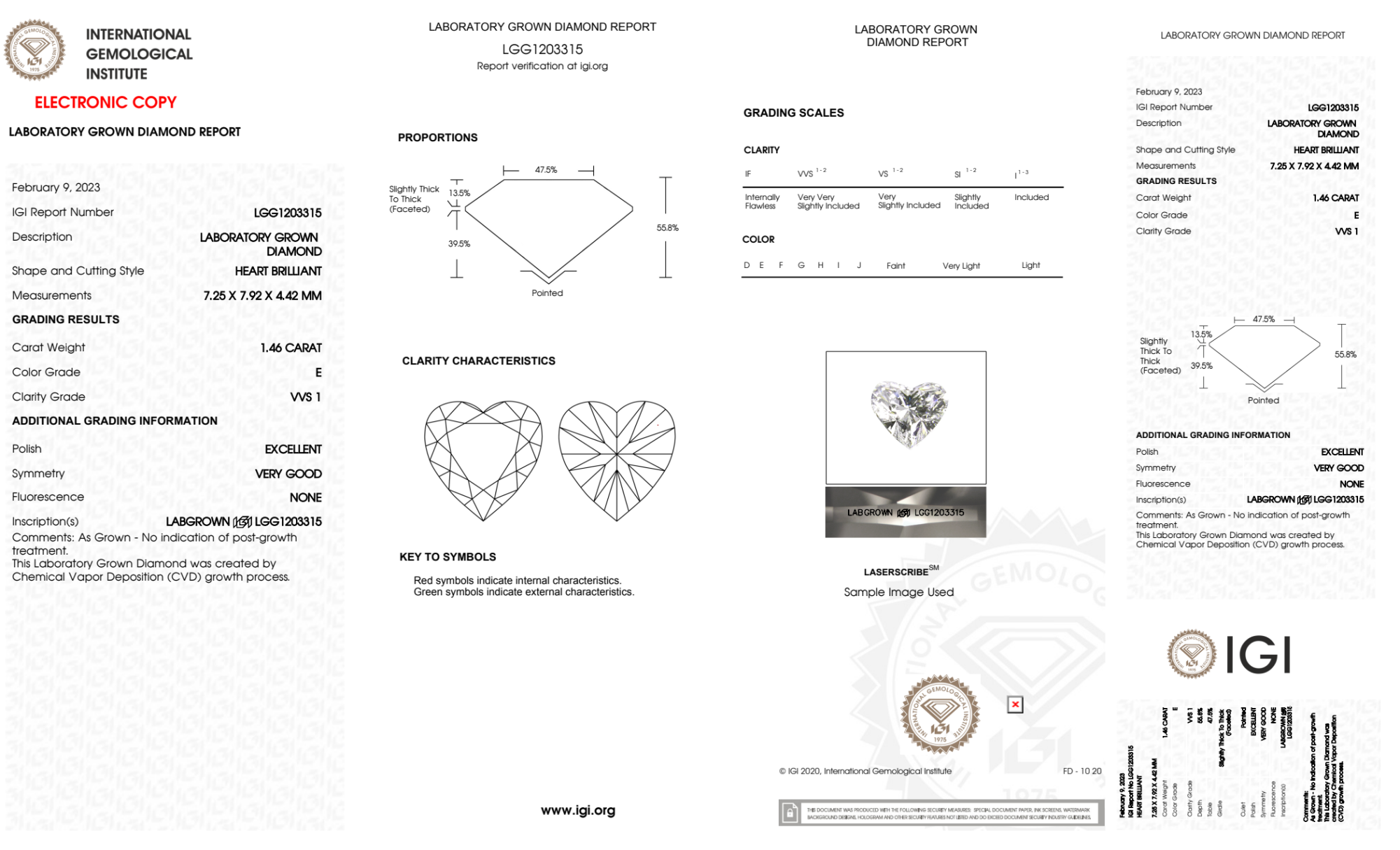 Your 1.46 carat Heart lab diamond is graded E color (Colorless), and you can read more about E color diamonds here.