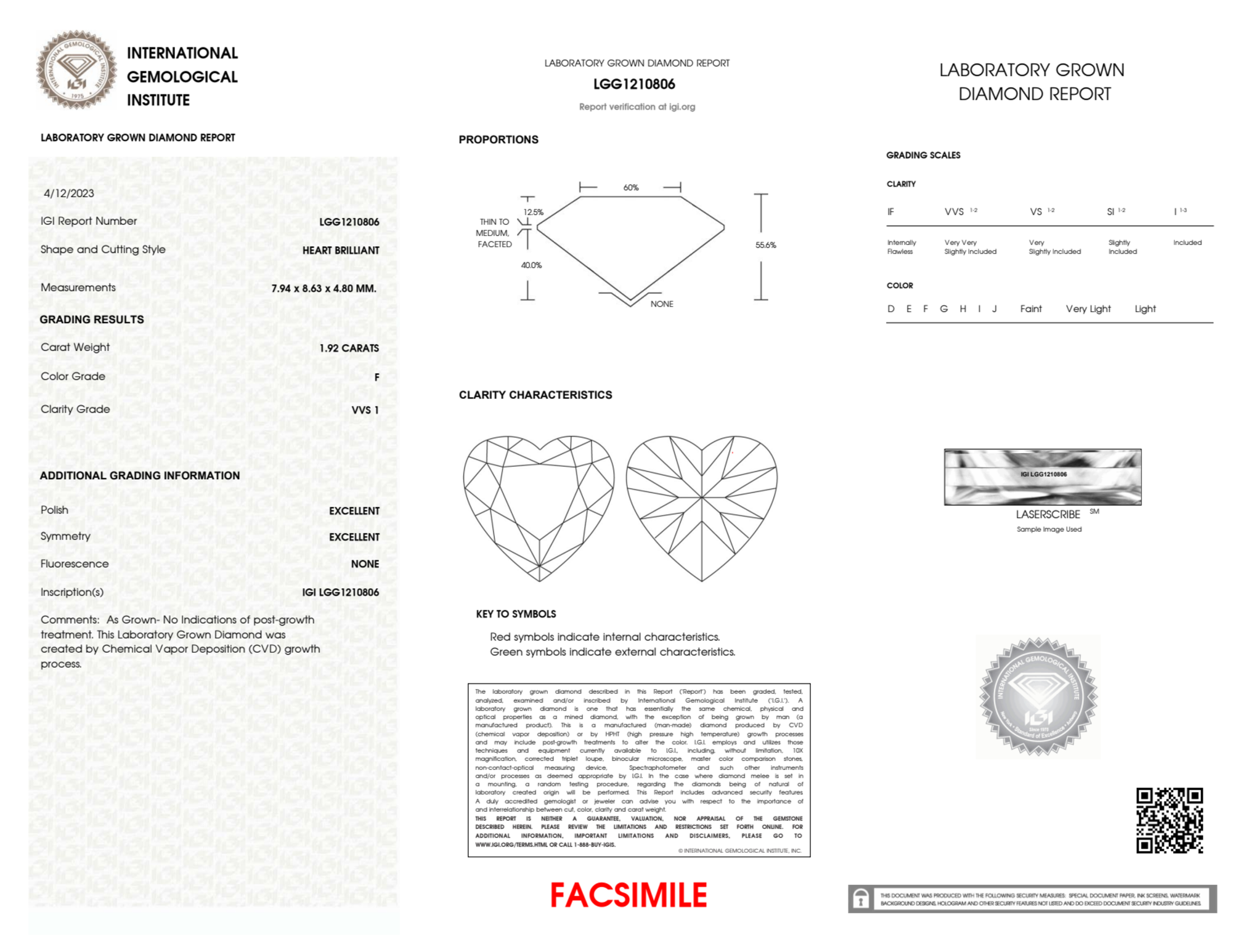 Your 1.92 carat Heart lab diamond is graded F color (Colorless), and you can read more about F color diamonds here.