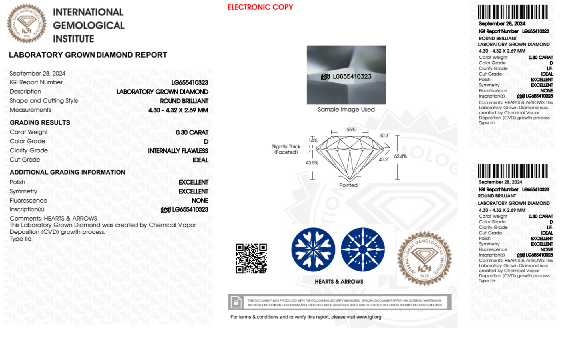 Your 0.30 carat Round lab diamond is graded IF clarity, which stands for Internally Flawless. Read more about IF clarity diamonds here, or learn more about diamond clarity in general here.