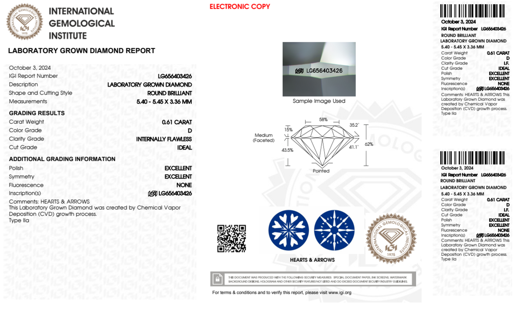 Your 0.61 carat Round lab diamond is graded IF clarity, which stands for Internally Flawless. Read more about IF clarity diamonds here, or learn more about diamond clarity in general here.