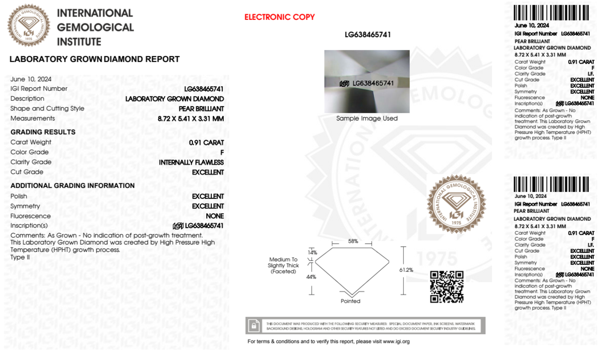 Your 0.91 carat Pear lab diamond is graded IF clarity, which stands for Internally Flawless. Read more about IF clarity diamonds here, or learn more about diamond clarity in general here.