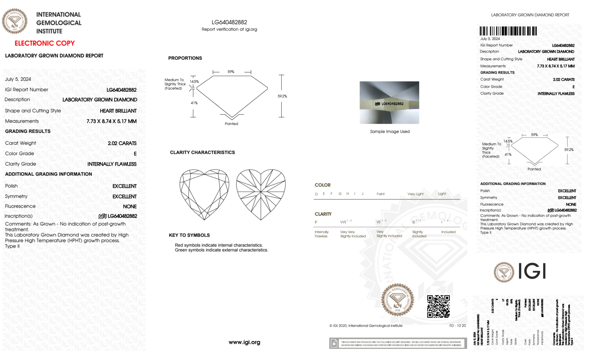 Your 2.02 carat Heart lab diamond is graded E color (Colorless), and you can read more about E color diamonds here.