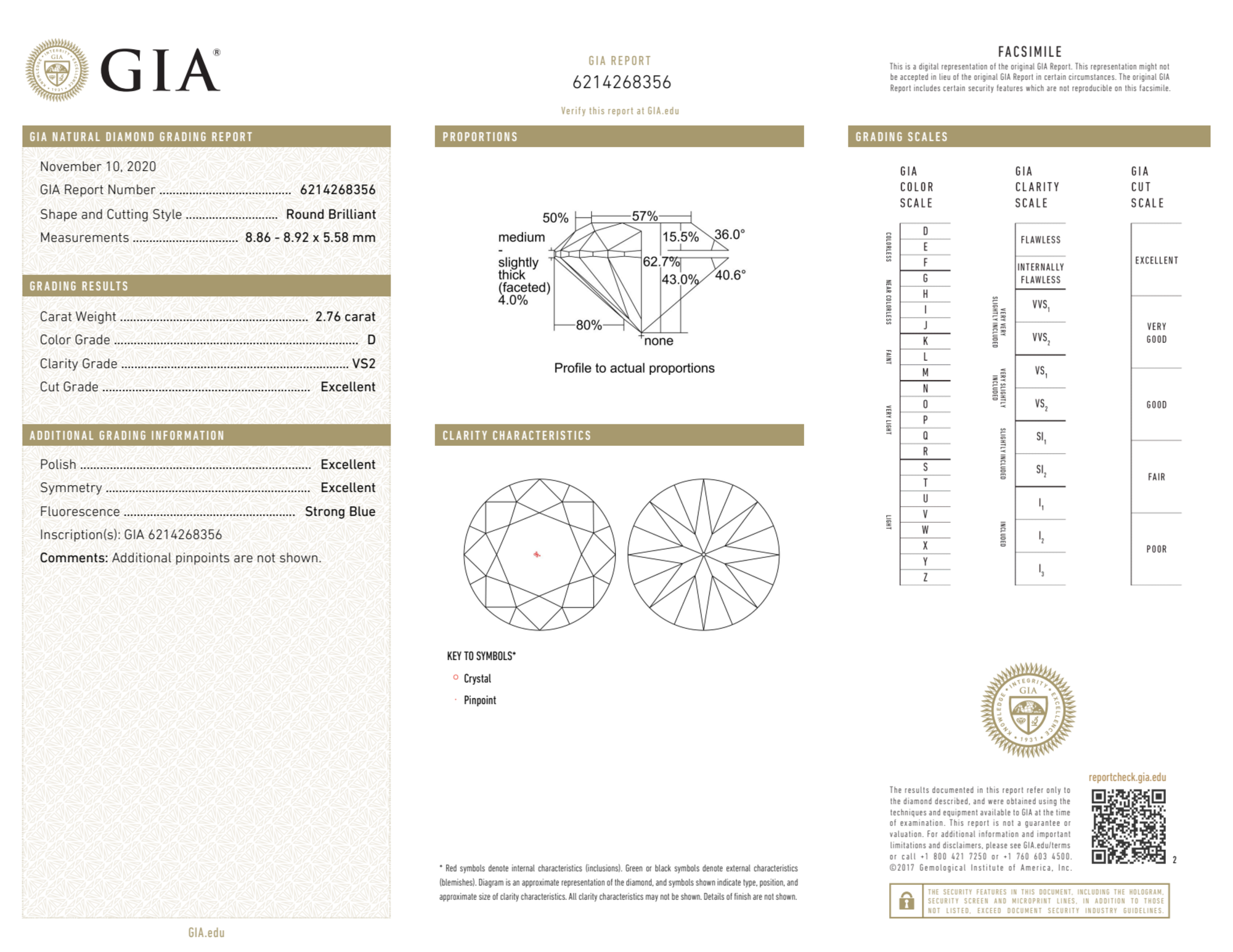 Your 2.76 carat Round natural diamond is graded D color (Colorless), and you can read more about D color diamonds here.