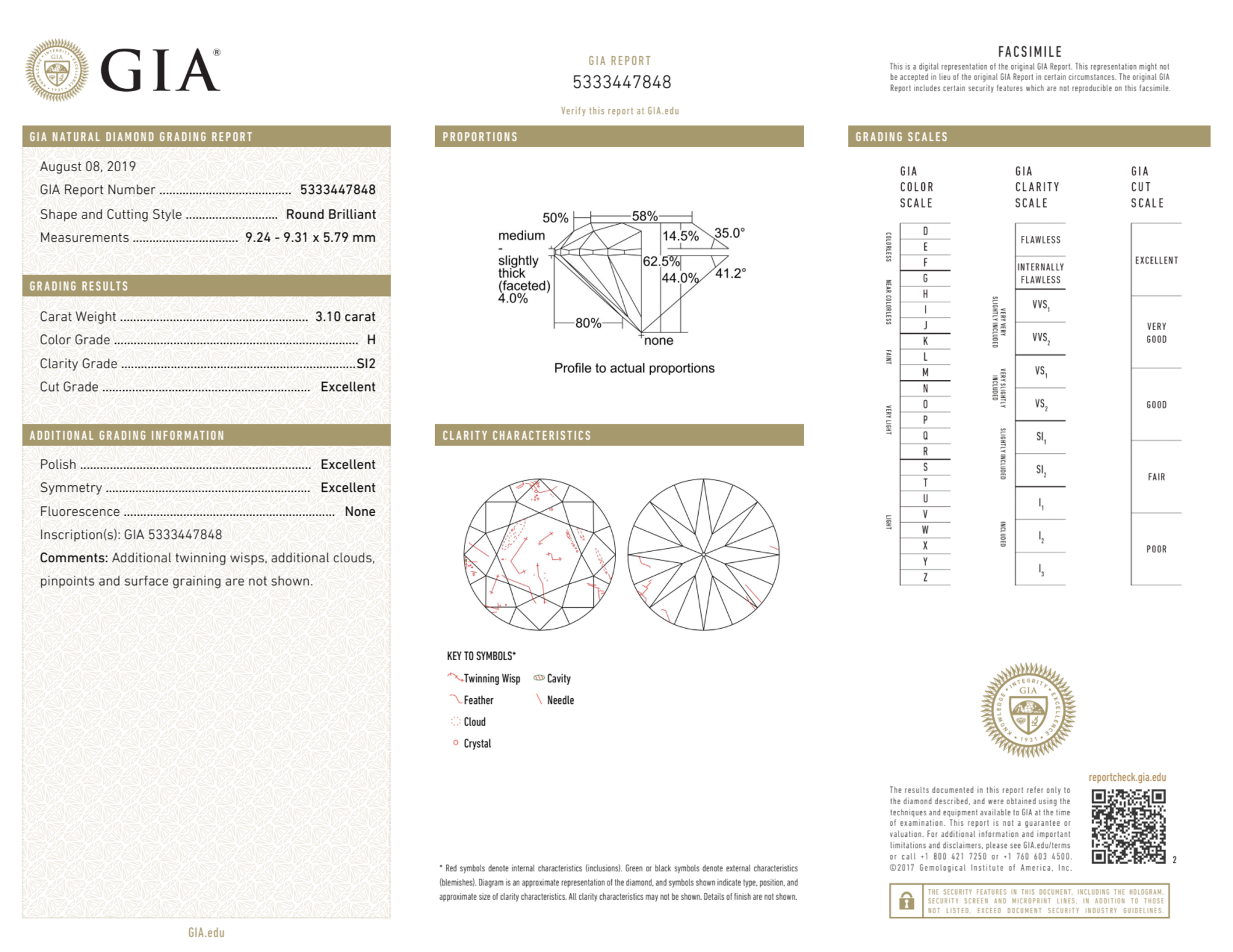 Your 3.10 carat Round natural diamond is graded SI2 clarity, which stands for Slightly Included 2. Read more about SI2 clarity diamonds here, or learn more about diamond clarity in general here.