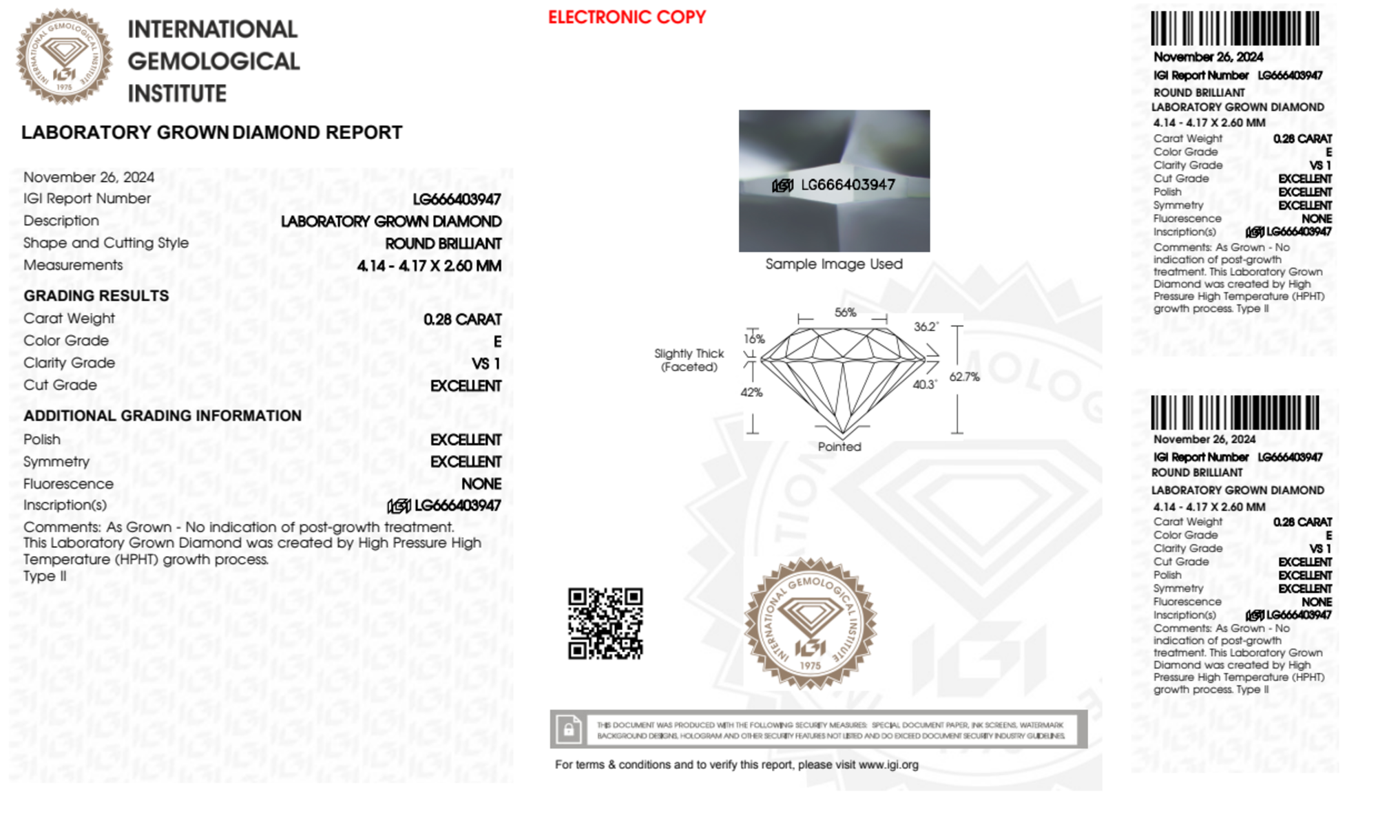 Your 0.28 carat Round lab diamond is graded E color (Colorless), and you can read more about E color diamonds here.