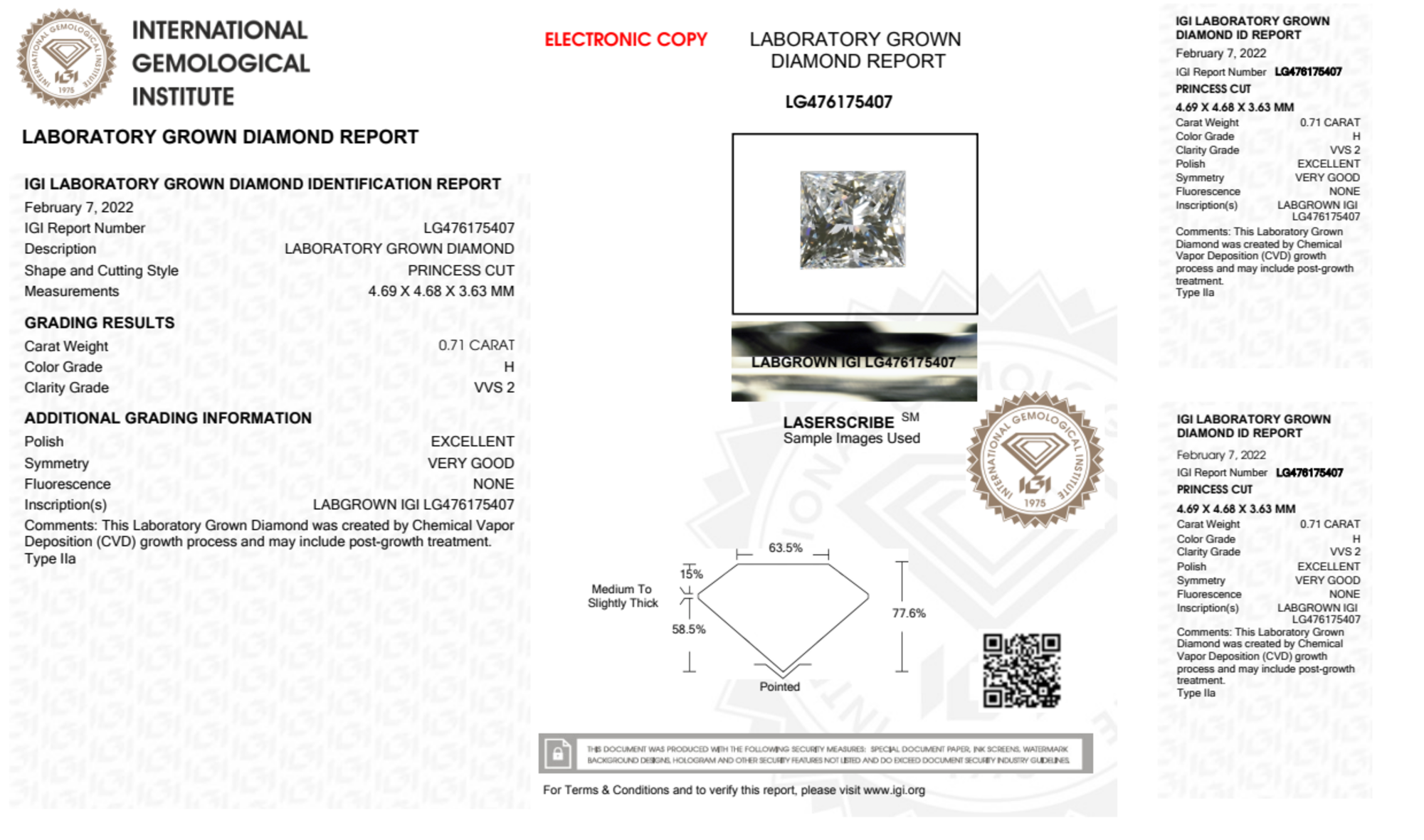Your 0.71 carat Princess lab diamond is graded H color (Near Colorless), and you can read more about H color diamonds here.