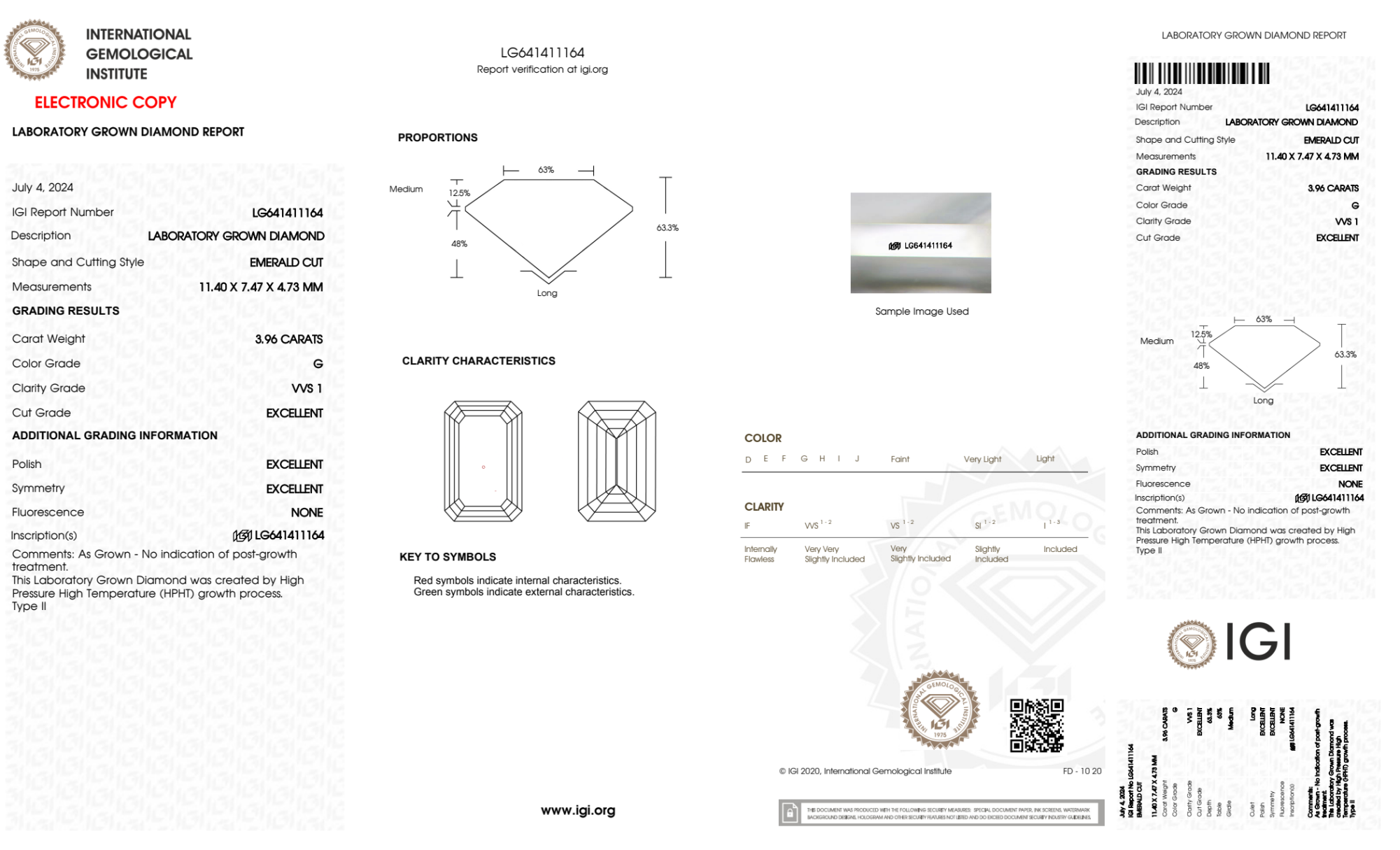 Your 3.96 carat Emerald lab diamond is graded VVS1 clarity, which stands for Very Very Slightly Included 1. Read more about VVS1 clarity diamonds here, or learn more about diamond clarity in general here.