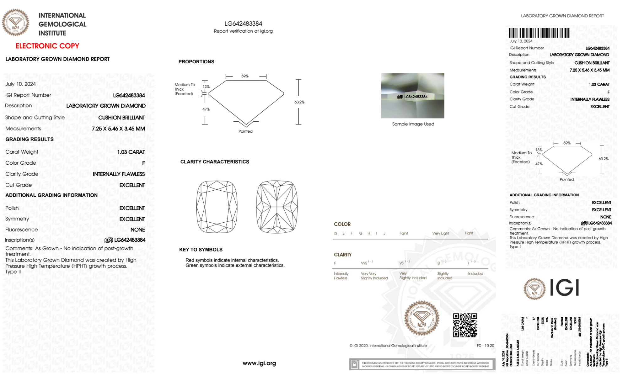 Your 1.03 carat Cushion lab diamond is graded F color (Colorless), and you can read more about F color diamonds here.