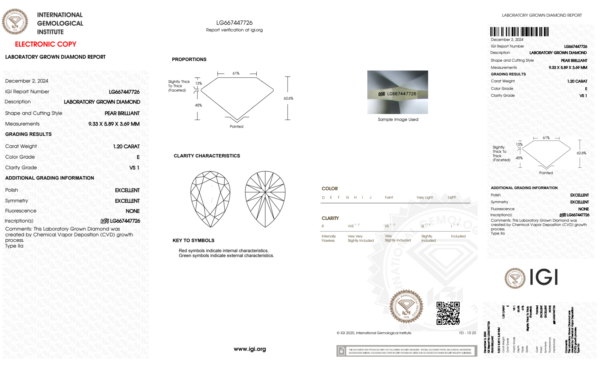 Your 1.20 carat Pear lab diamond is graded E color (Colorless), and you can read more about E color diamonds here.