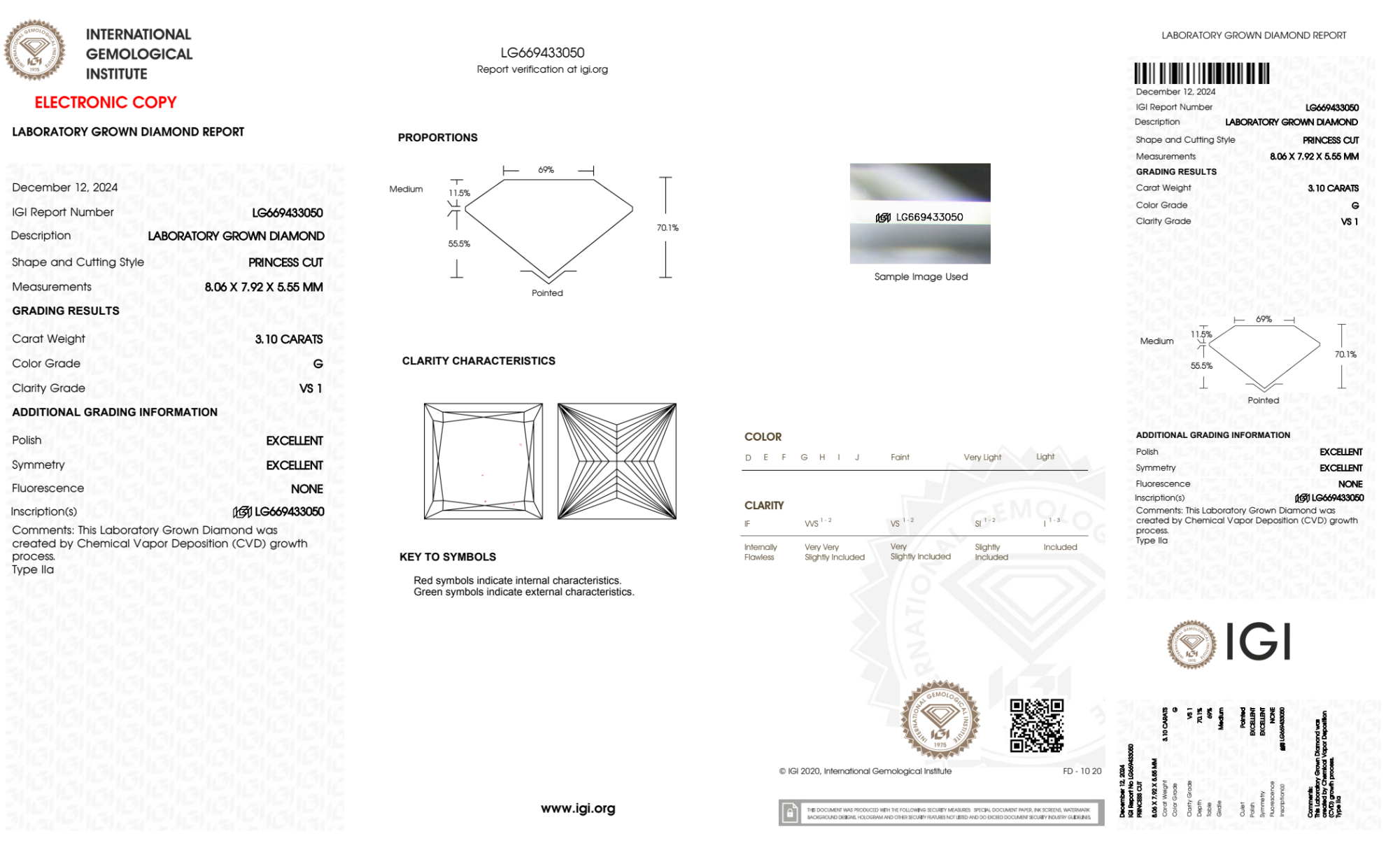 Your 3.10 carat Princess lab diamond is graded VS1 clarity, which stands for Very Slightly Included 1. Read more about VS1 clarity diamonds here, or learn more about diamond clarity in general here.