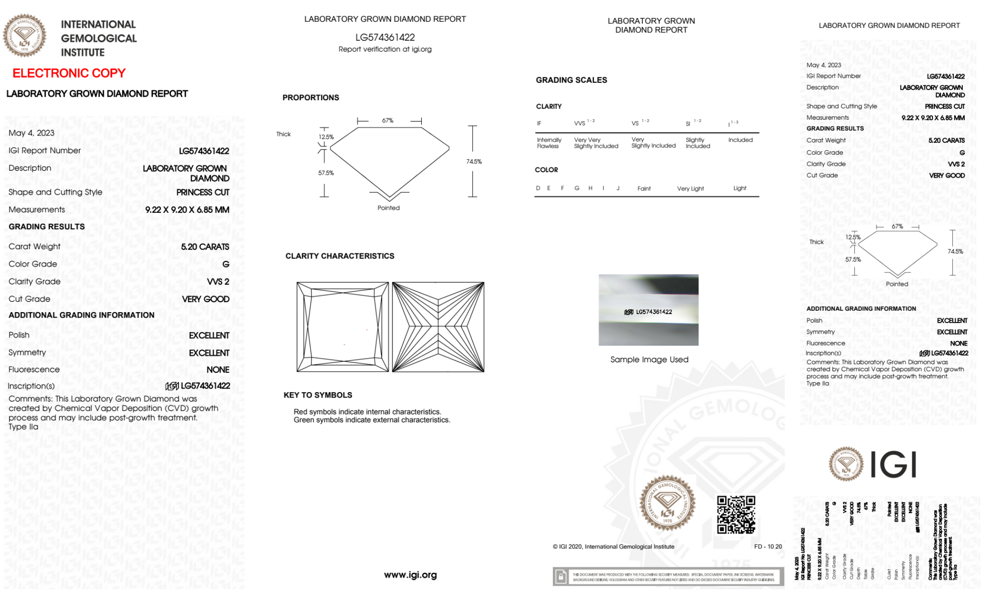 Your 5.20 carat Princess lab diamond is graded G color (Near Colorless), and you can read more about G color diamonds here.