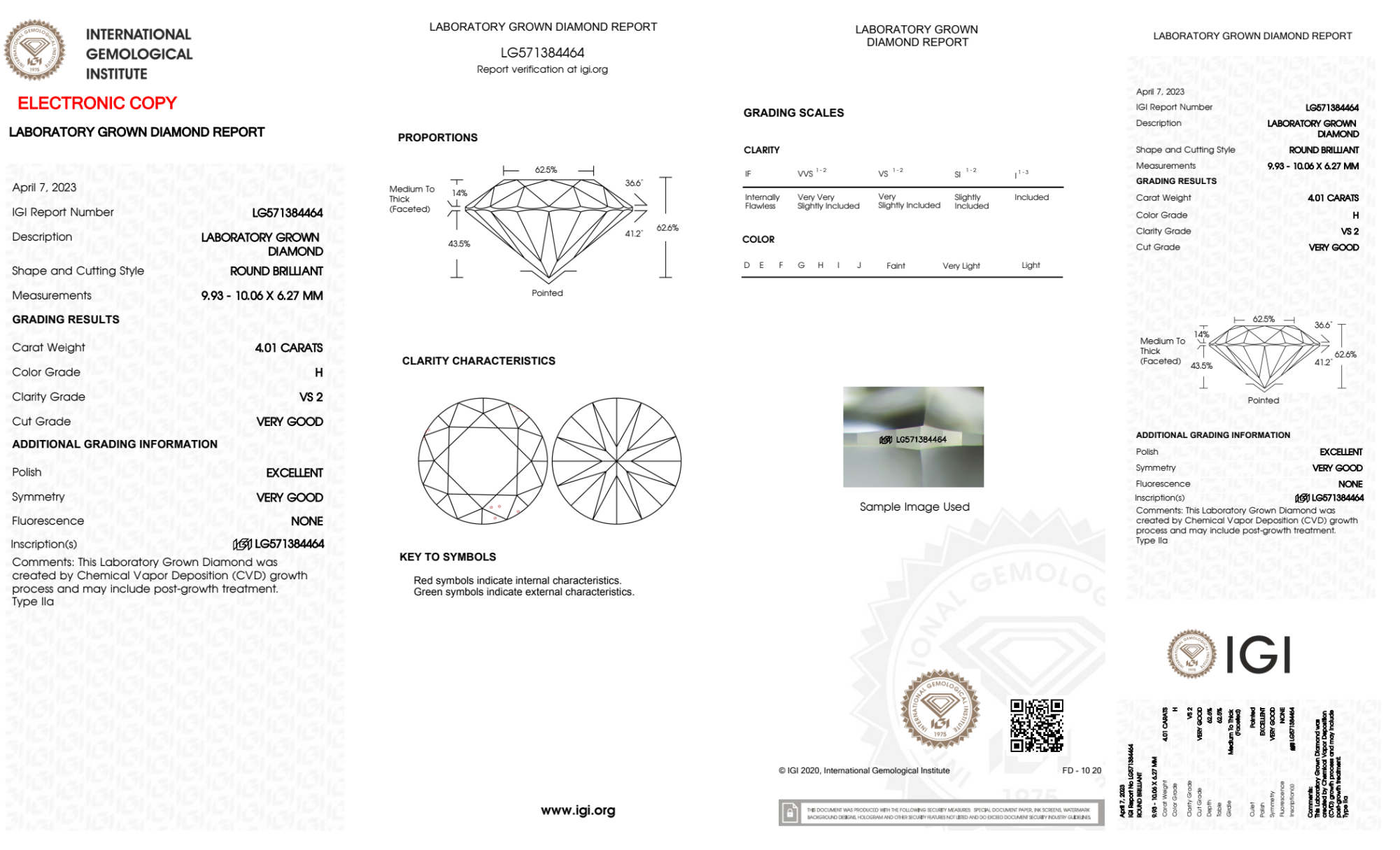Your 4.01 carat Round lab diamond is graded VS2 clarity, which stands for Very Slightly Included 2. Read more about VS2 clarity diamonds here, or learn more about diamond clarity in general here.
