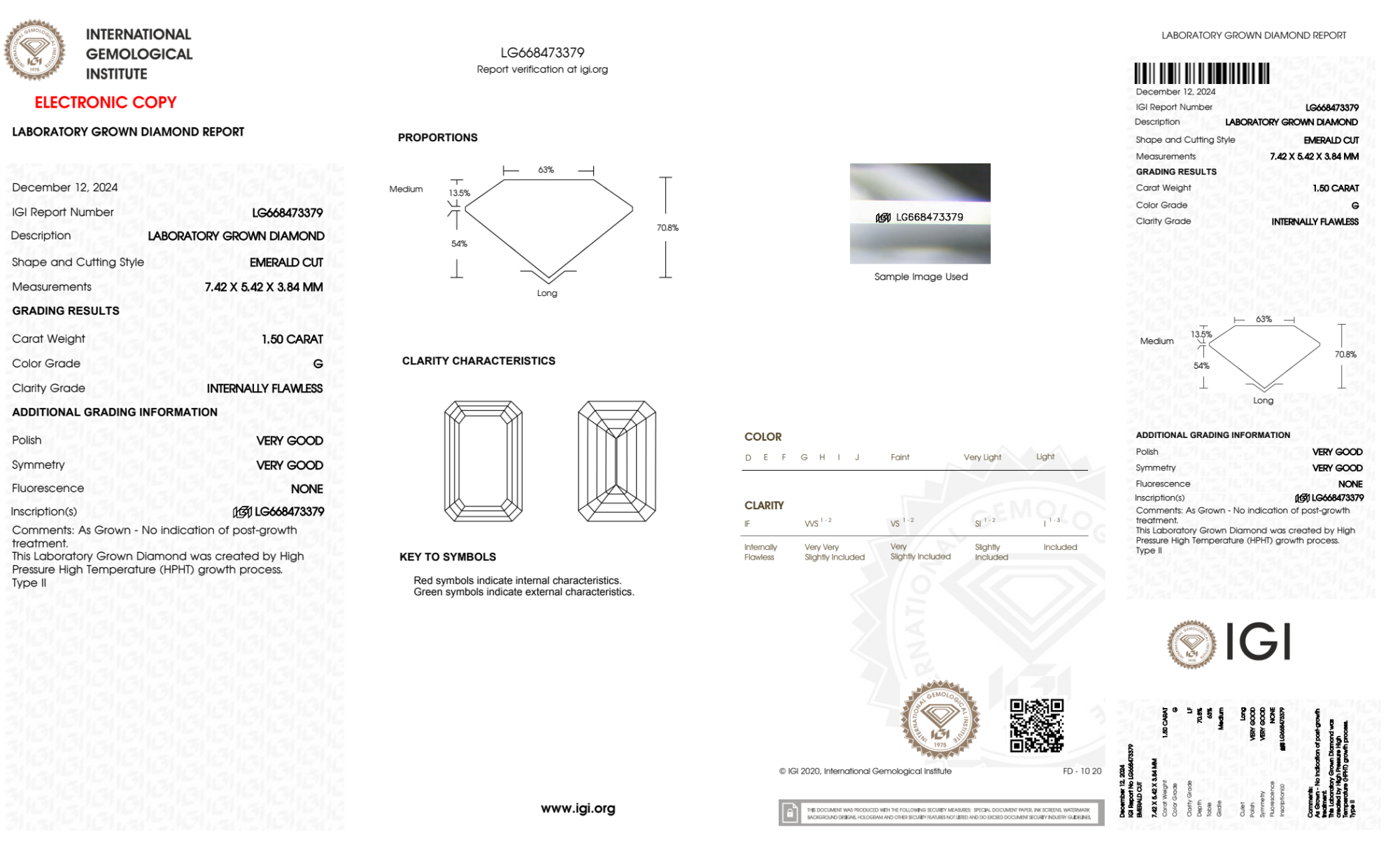 Your 1.50 carat Emerald lab diamond is graded IF clarity, which stands for Internally Flawless. Read more about IF clarity diamonds here, or learn more about diamond clarity in general here.