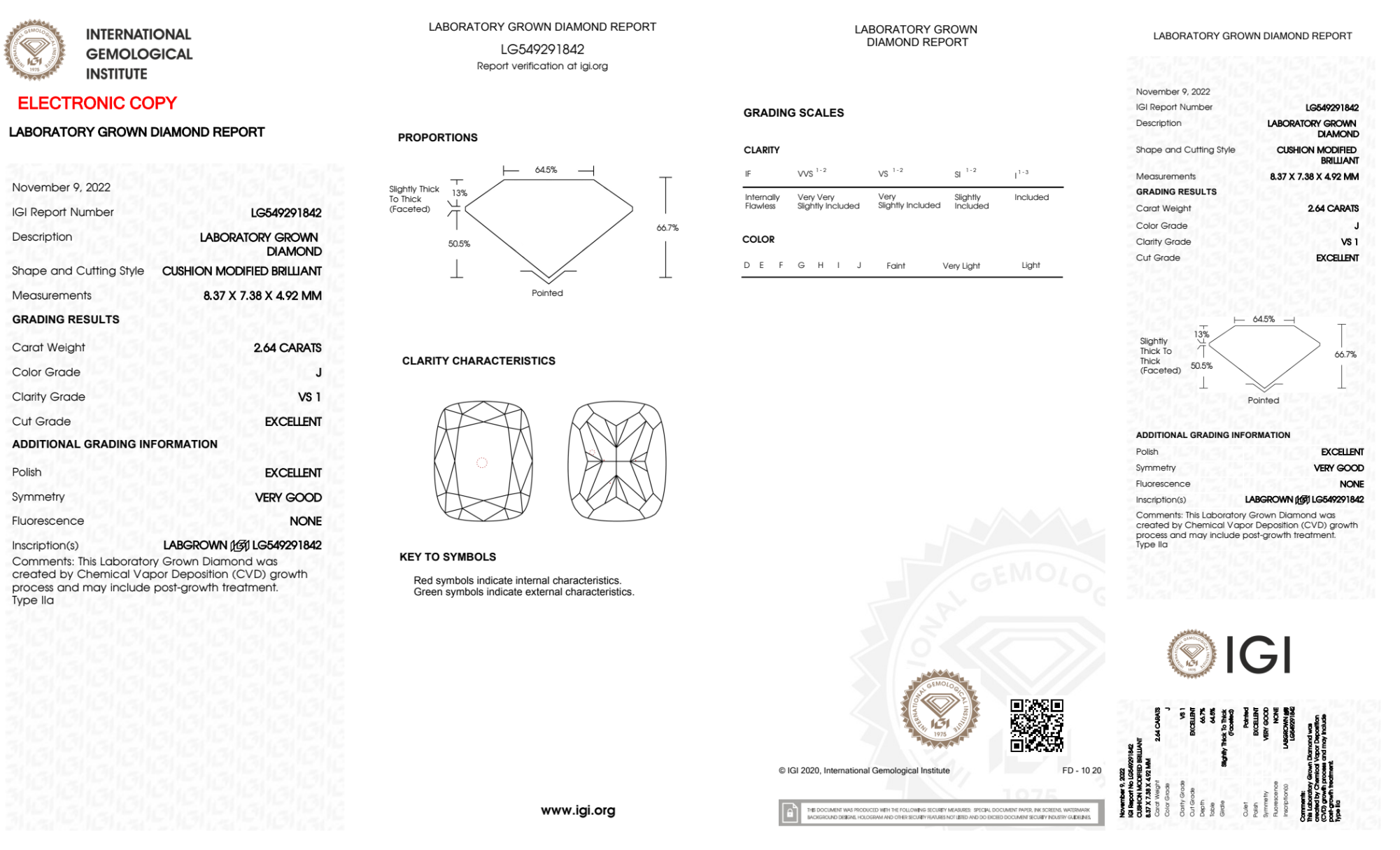 Your 2.64 carat Cushion lab diamond is graded J color (Near Colorless), and you can read more about J color diamonds here.