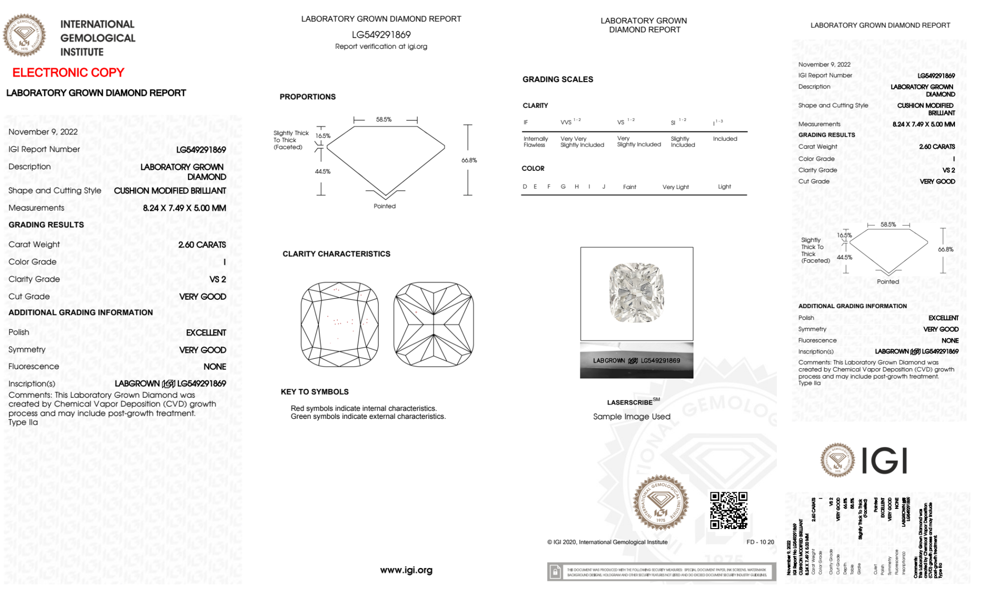 Your 2.60 carat Cushion lab diamond is graded VS2 clarity, which stands for Very Slightly Included 2. Read more about VS2 clarity diamonds here, or learn more about diamond clarity in general here.