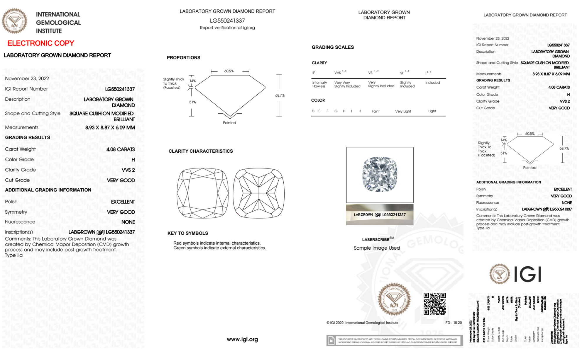 Your 4.08 carat Cushion lab diamond is graded H color (Near Colorless), and you can read more about H color diamonds here.
