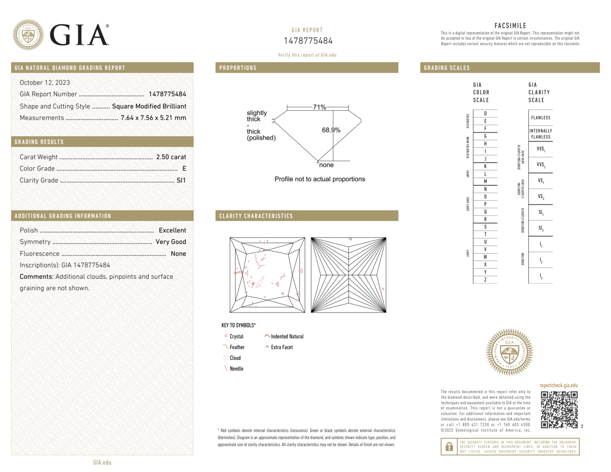 Your 2.50 carat Princess natural diamond is graded E color (Colorless), and you can read more about E color diamonds here.