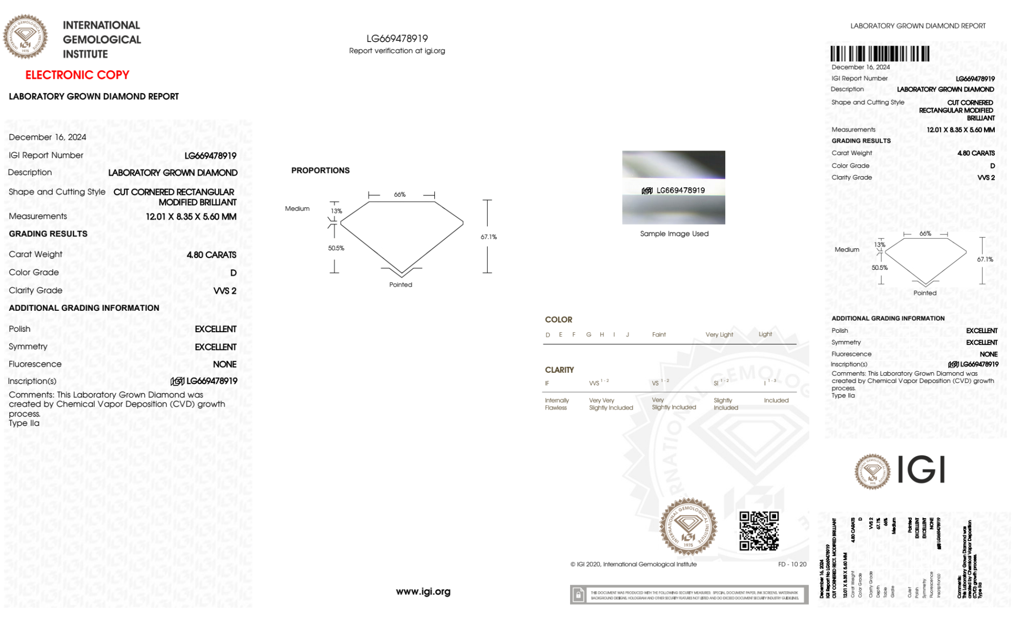 Your 4.80 carat Radiant lab diamond is graded D color (Colorless), and you can read more about D color diamonds here.