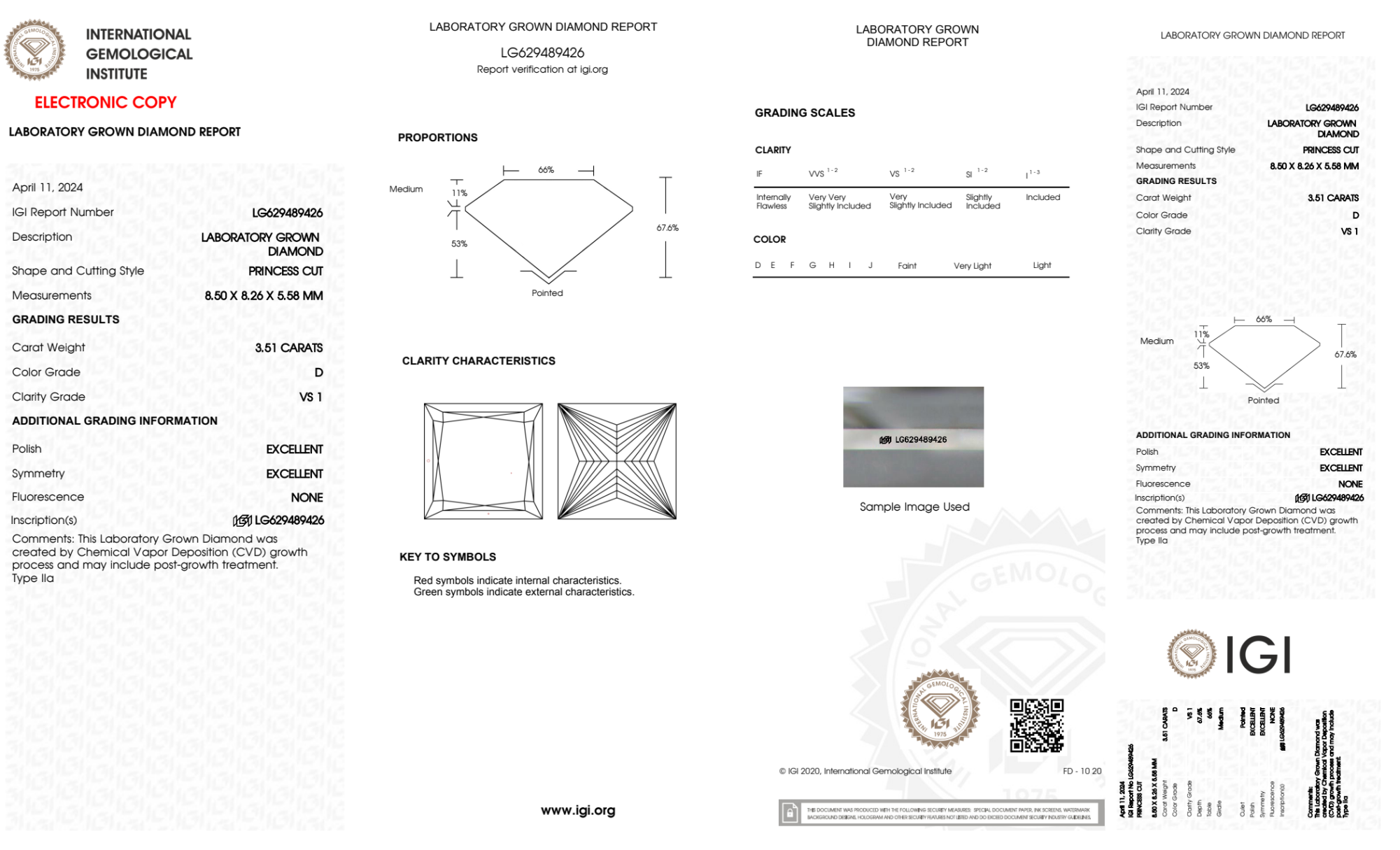 Your 3.51 carat Princess lab diamond is graded VS1 clarity, which stands for Very Slightly Included 1. Read more about VS1 clarity diamonds here, or learn more about diamond clarity in general here.