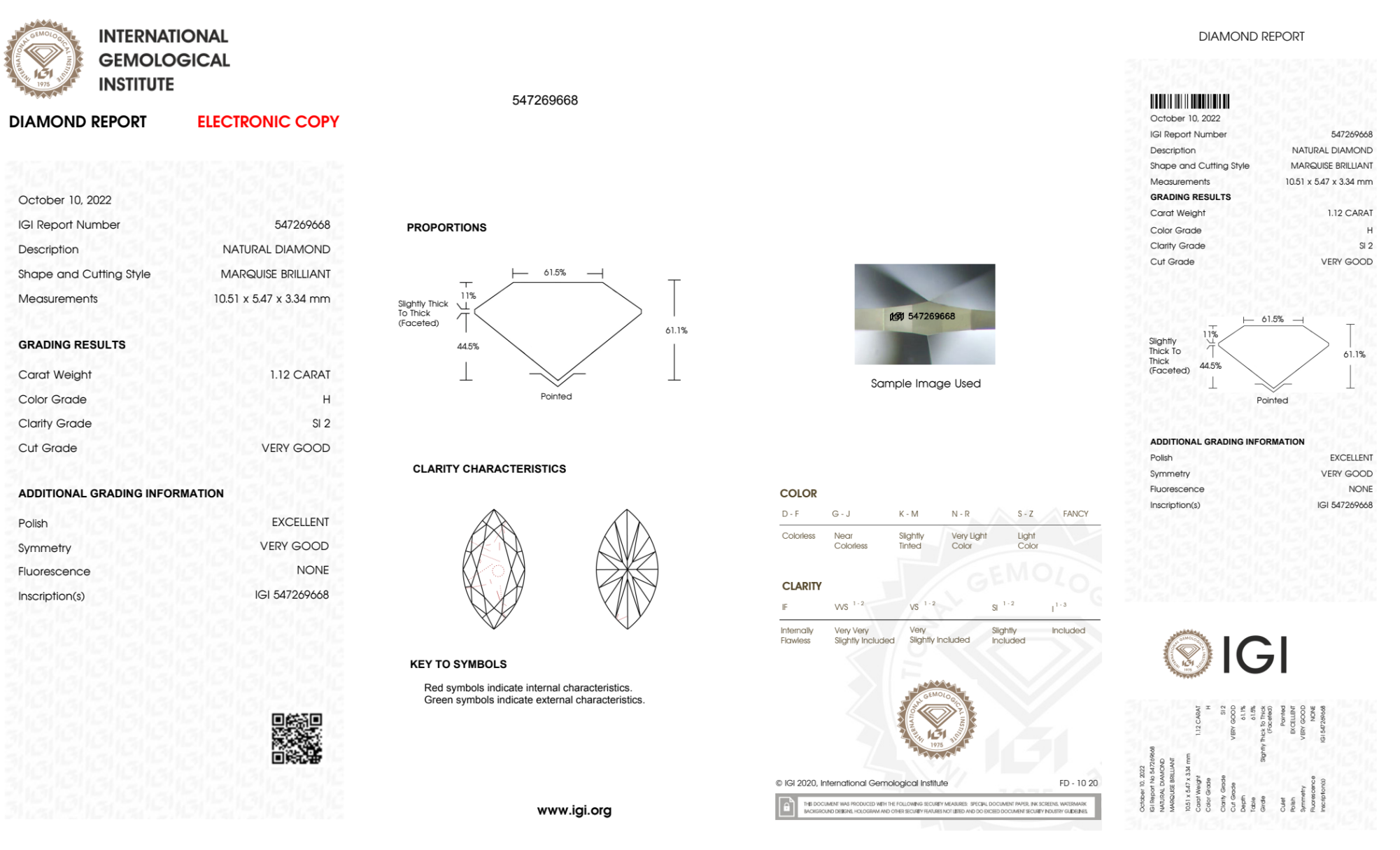 Your 1.12 carat Marquise natural diamond is graded H color (Near Colorless), and you can read more about H color diamonds here.
