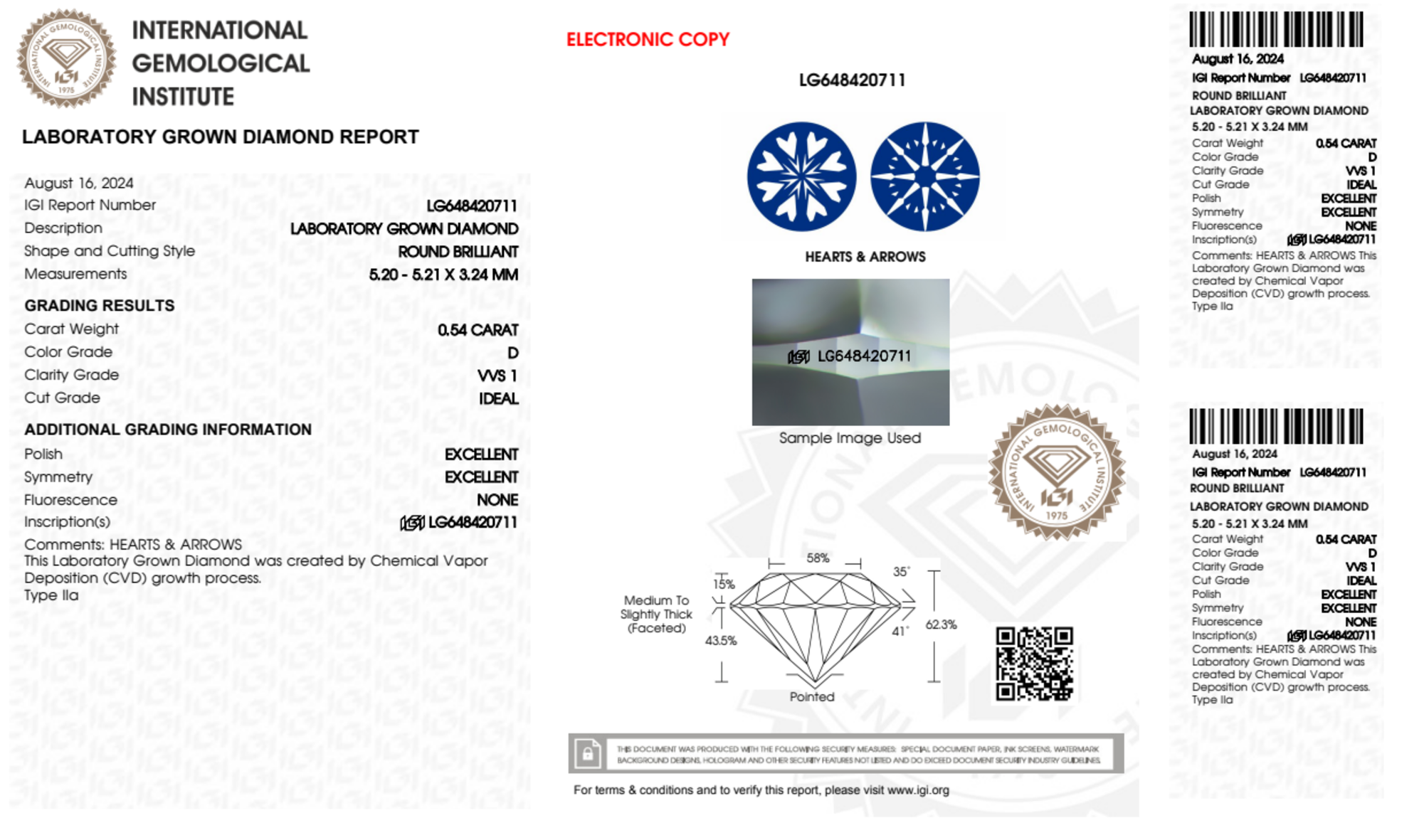 Your 0.54 carat Round lab diamond is graded VVS1 clarity, which stands for Very Very Slightly Included 1. Read more about VVS1 clarity diamonds here, or learn more about diamond clarity in general here.
