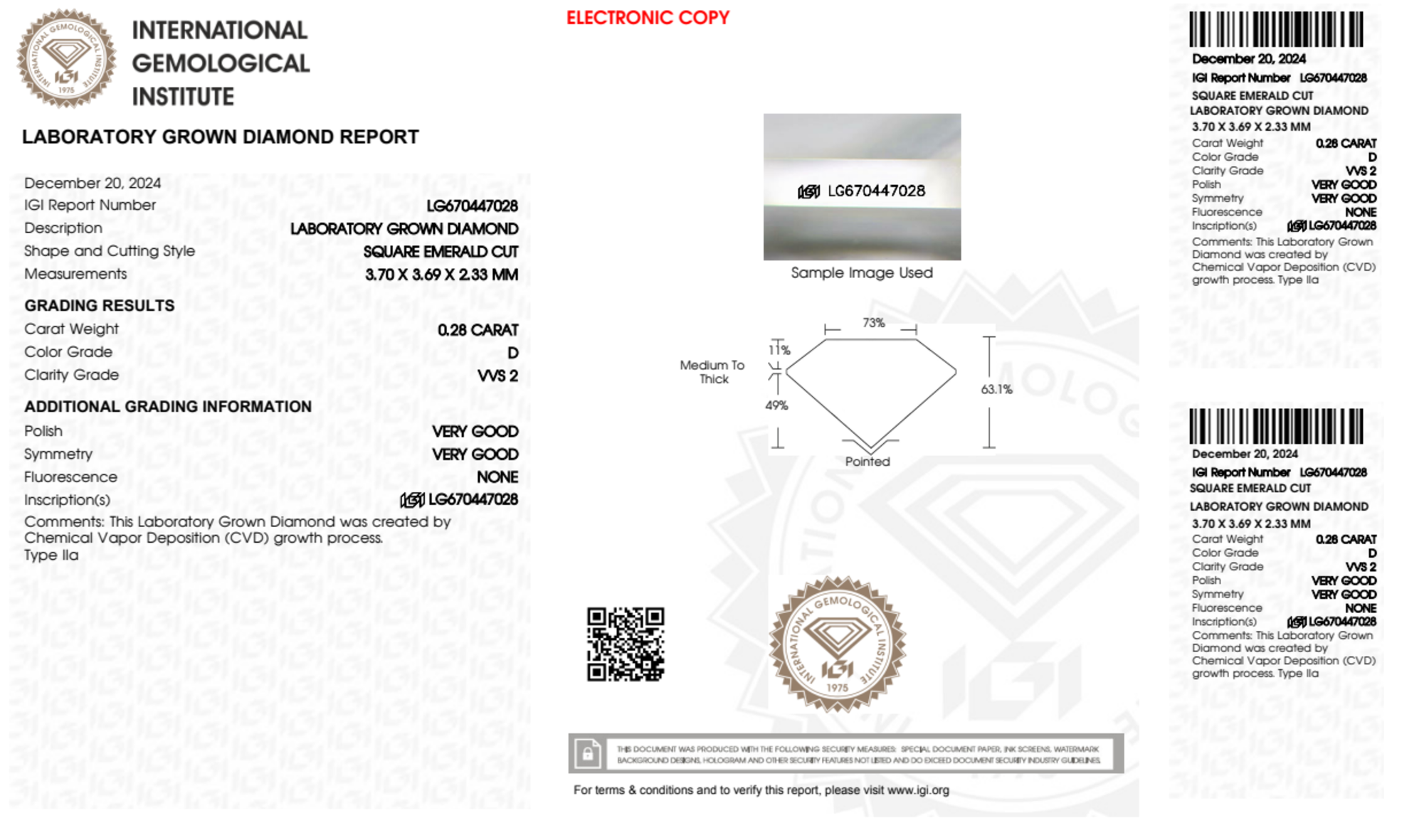 Your 0.28 carat Asscher lab diamond is graded D color (Colorless), and you can read more about D color diamonds here.