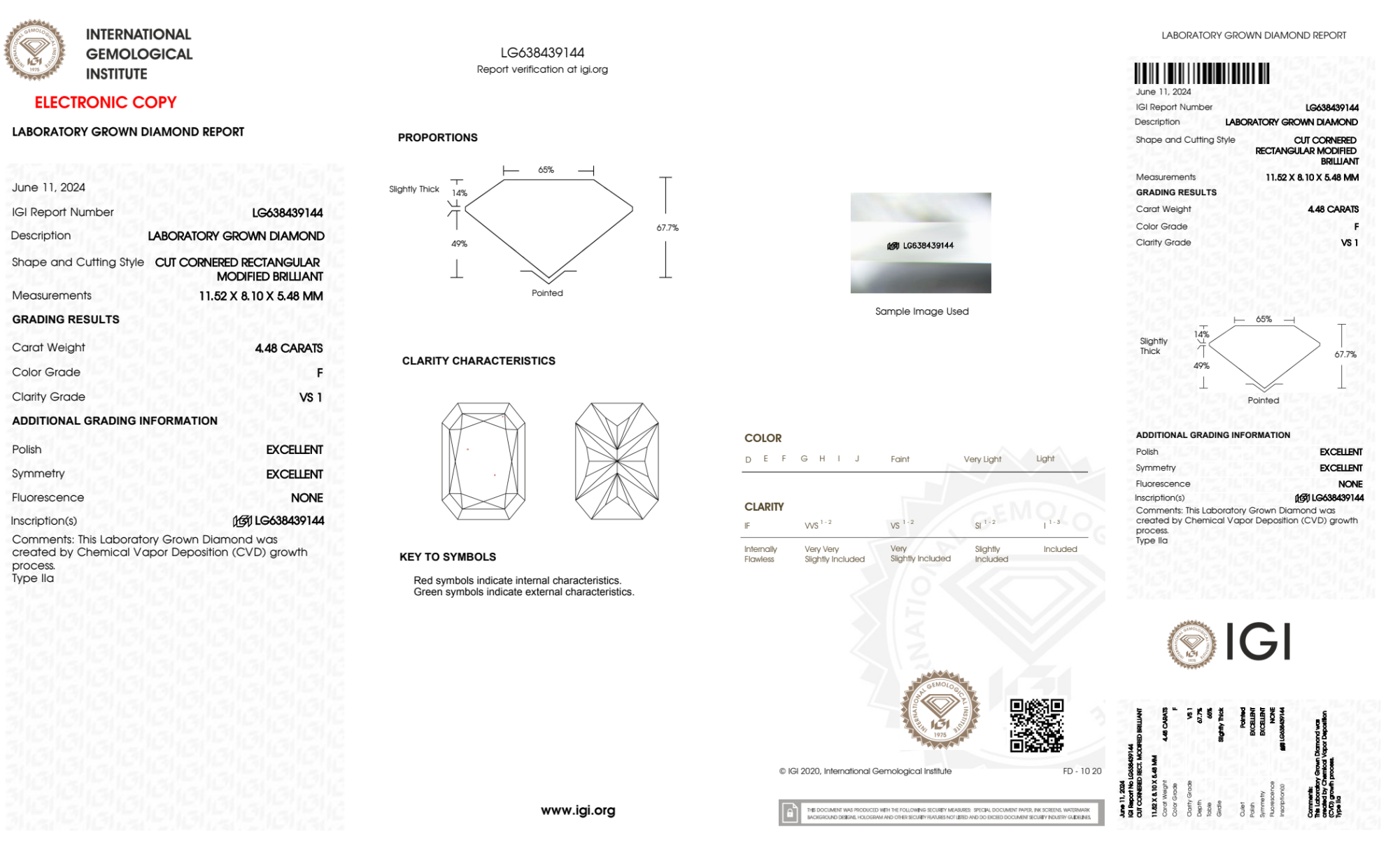 Your 4.48 carat Radiant lab diamond is graded F color (Colorless), and you can read more about F color diamonds here.