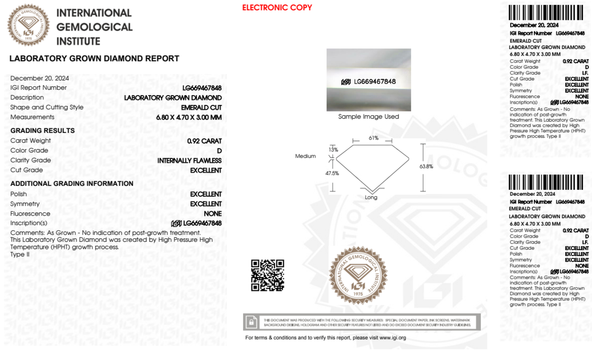 Your 0.92 carat Emerald lab diamond is graded IF clarity, which stands for Internally Flawless. Read more about IF clarity diamonds here, or learn more about diamond clarity in general here.