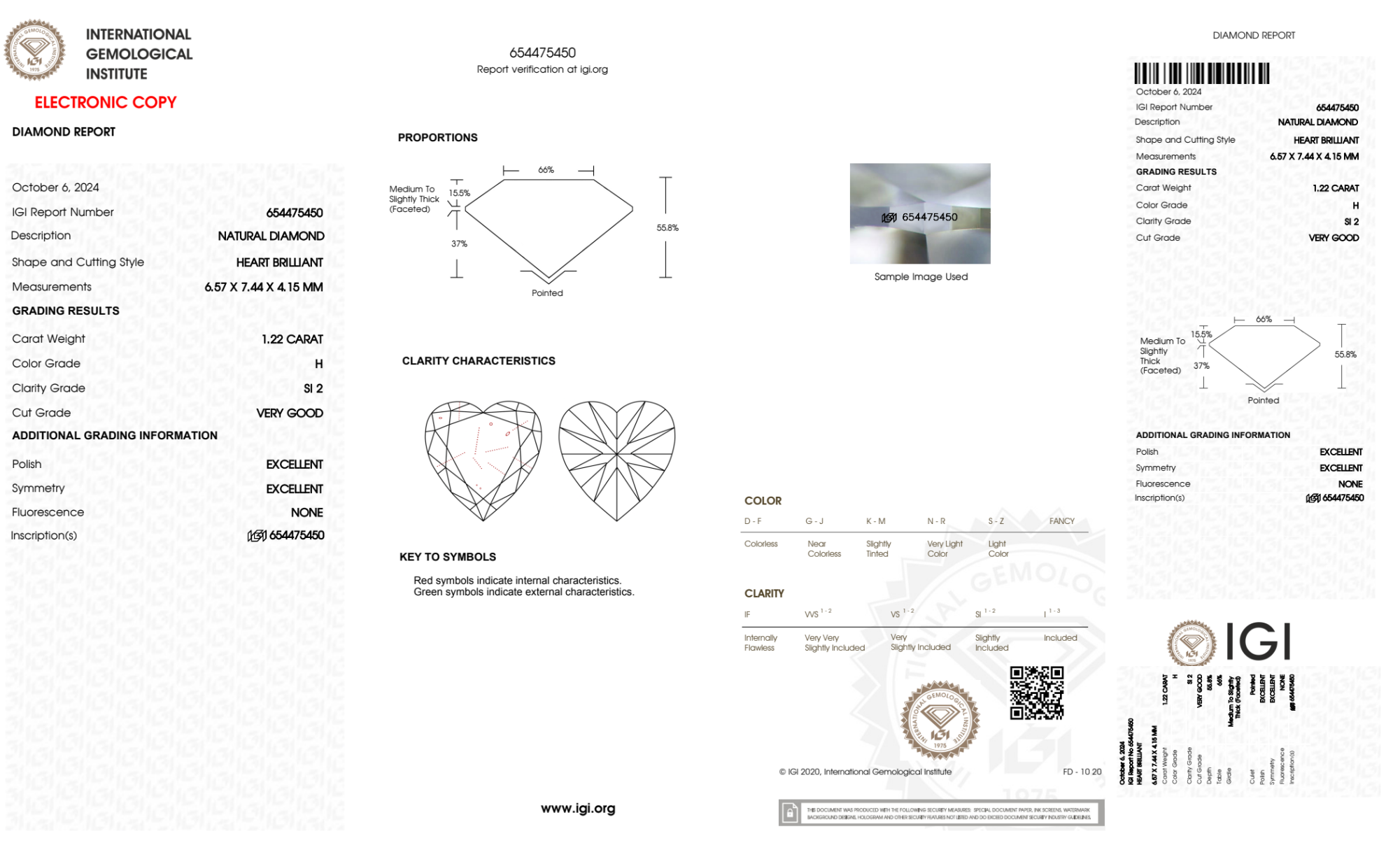 Your 1.22 carat Heart natural diamond is graded H color (Near Colorless), and you can read more about H color diamonds here.