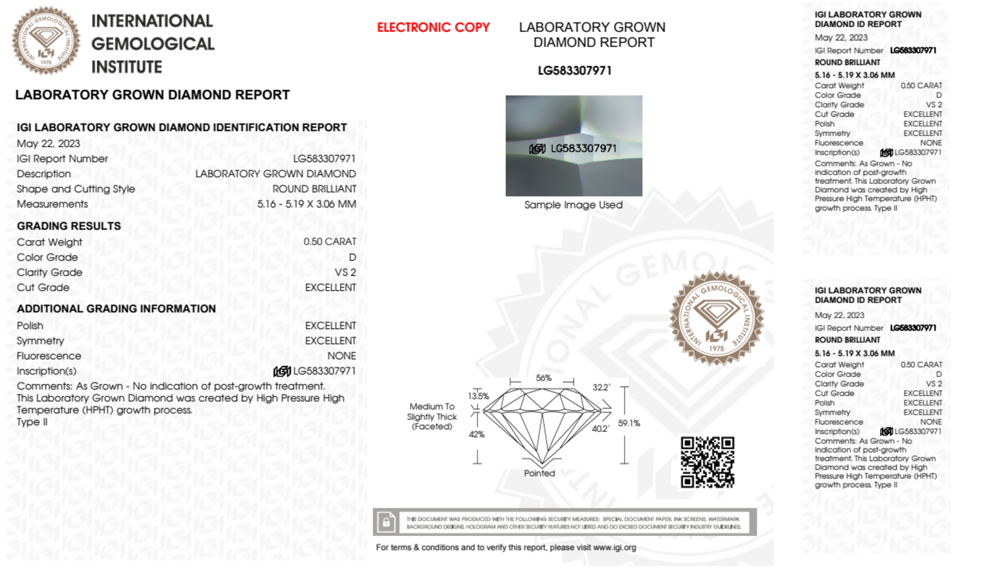 Your 0.50 carat Round lab diamond is graded D color (Colorless), and you can read more about D color diamonds here.