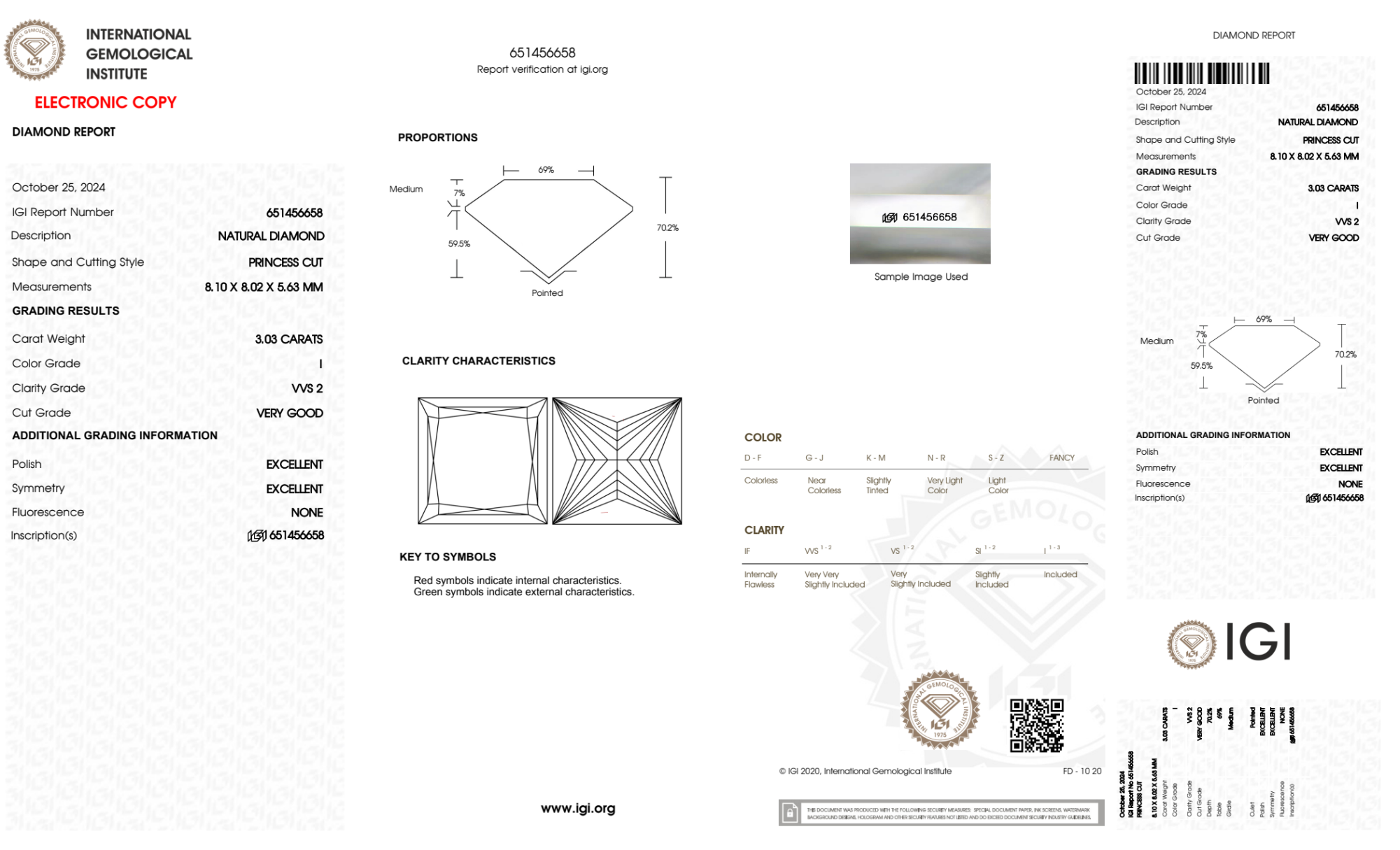 Your 3.03 carat Princess natural diamond is graded VVS2 clarity, which stands for Very Very Slightly Included 2. Read more about VVS2 clarity diamonds here, or learn more about diamond clarity in general here.