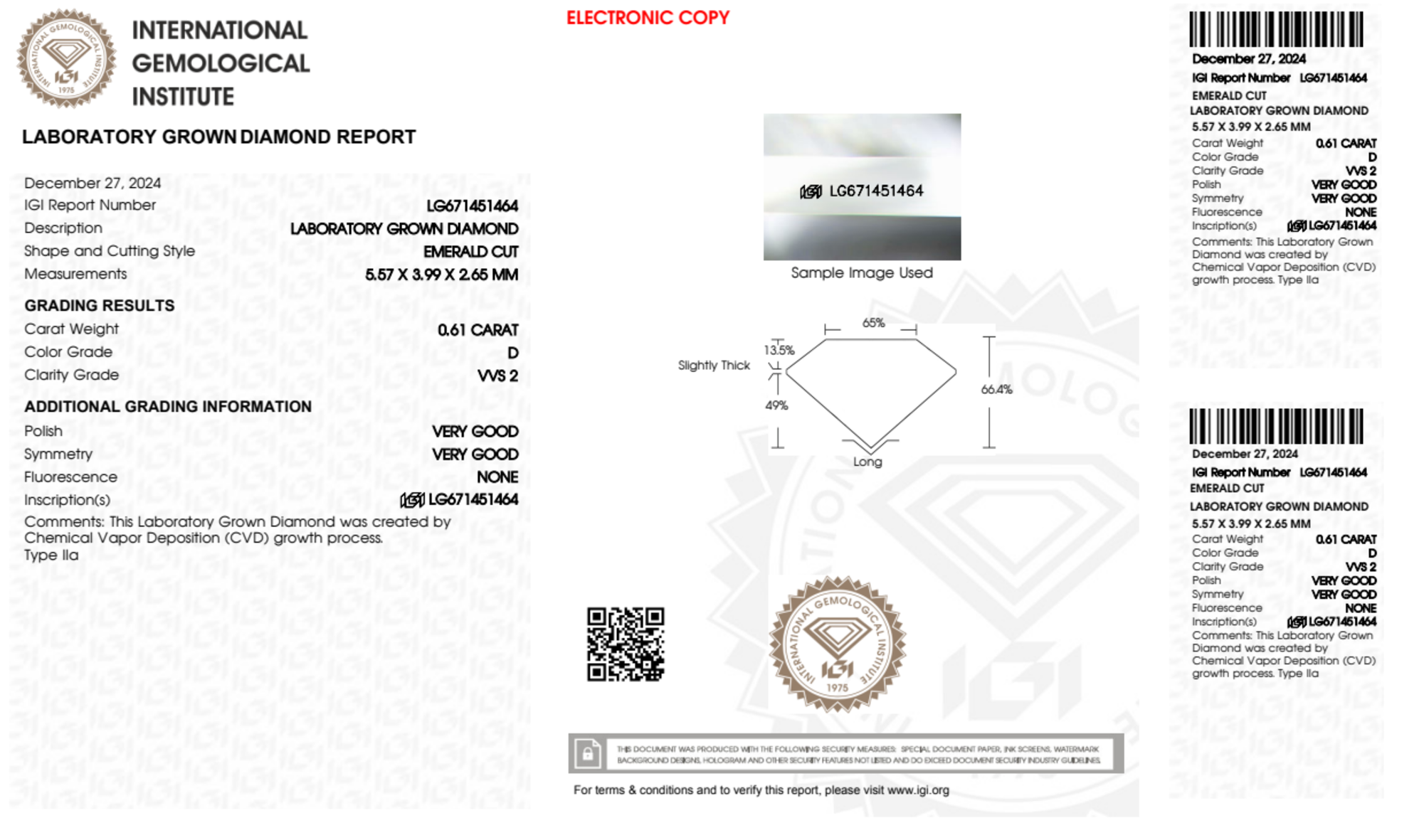 Your 0.61 carat Emerald lab diamond is graded D color (Colorless), and you can read more about D color diamonds here.