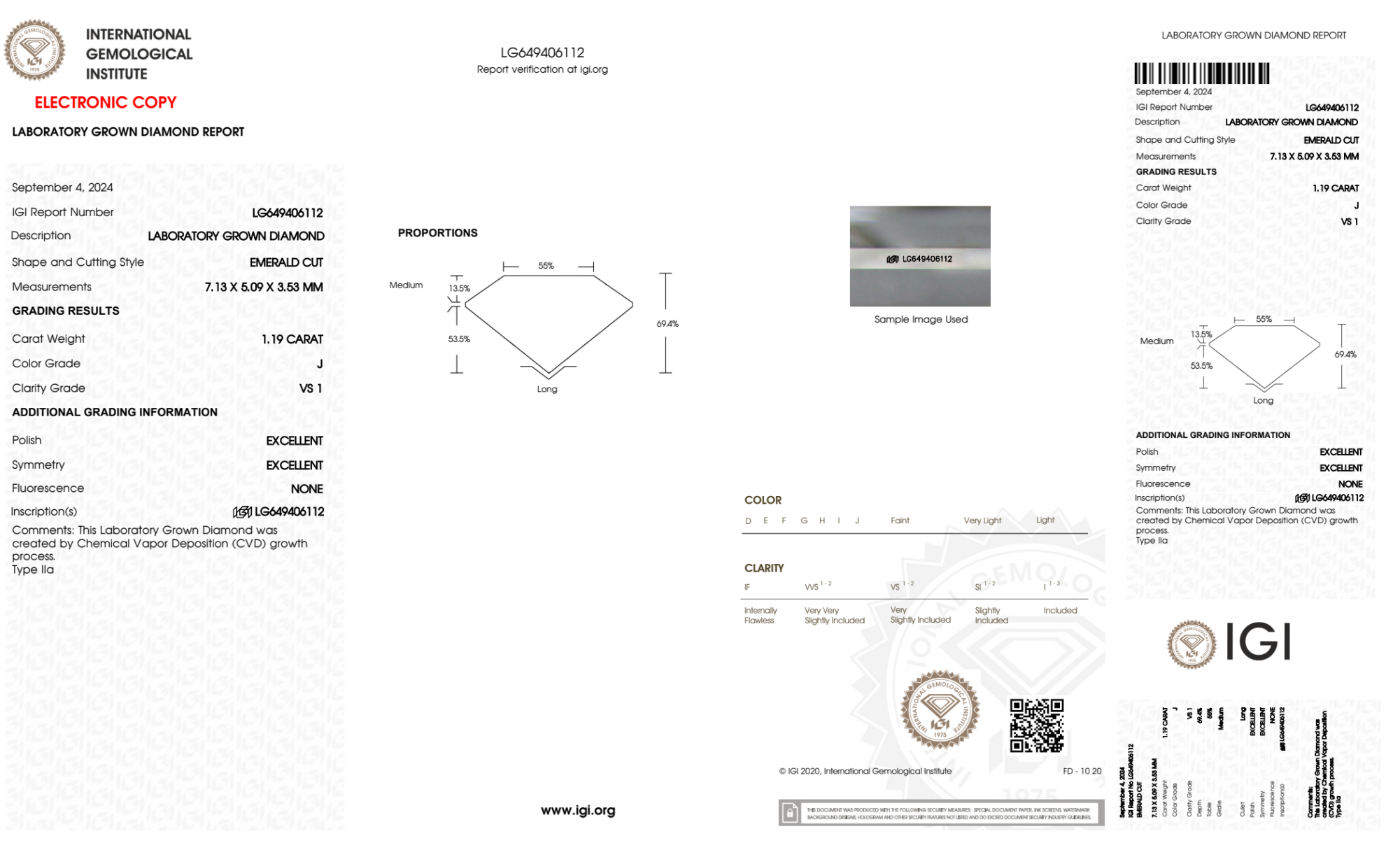 Your 1.19 carat Emerald lab diamond is graded J color (Near Colorless), and you can read more about J color diamonds here.