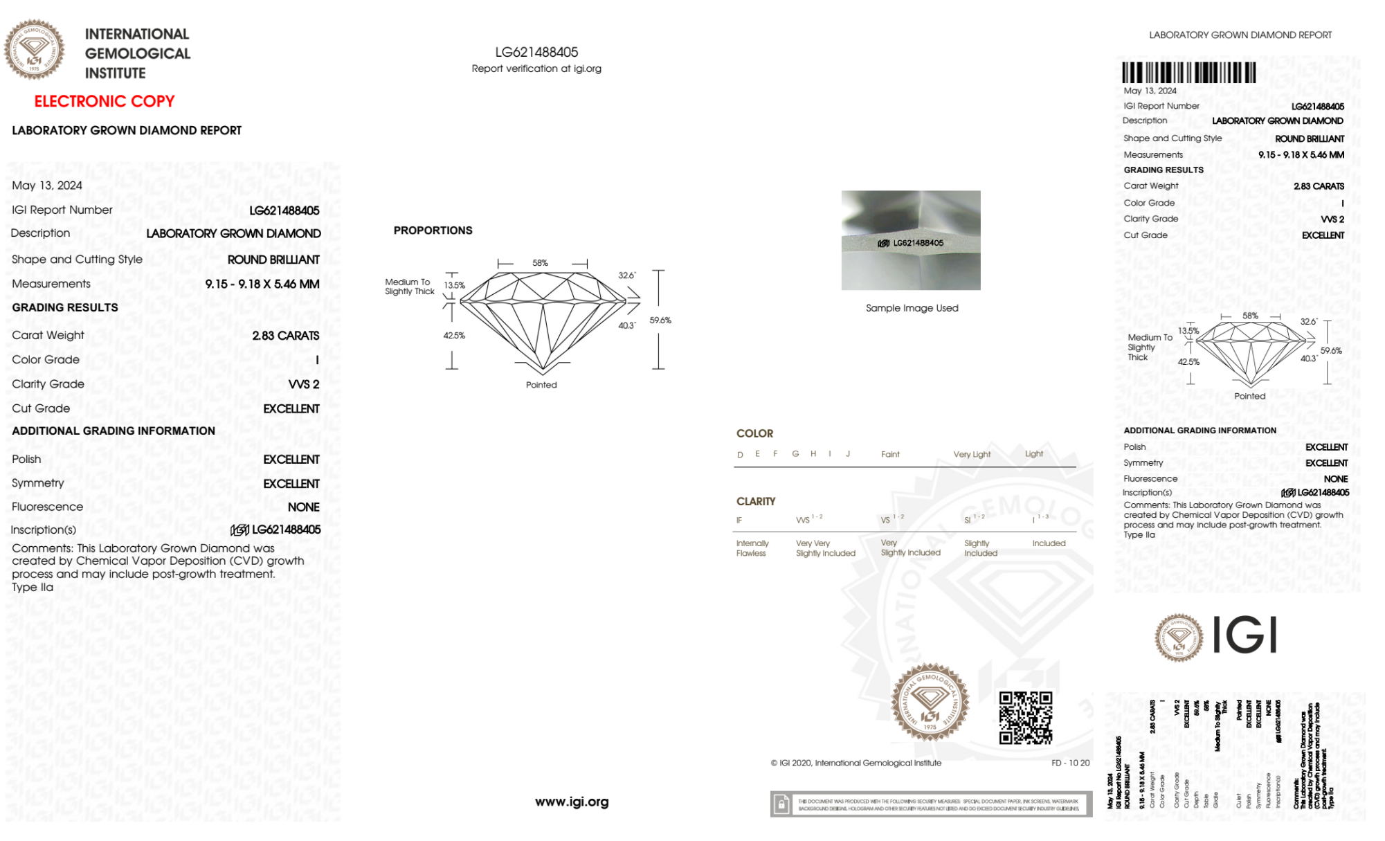 Your 2.83 carat Round lab diamond is graded I color (Near Colorless), and you can read more about I color diamonds here.