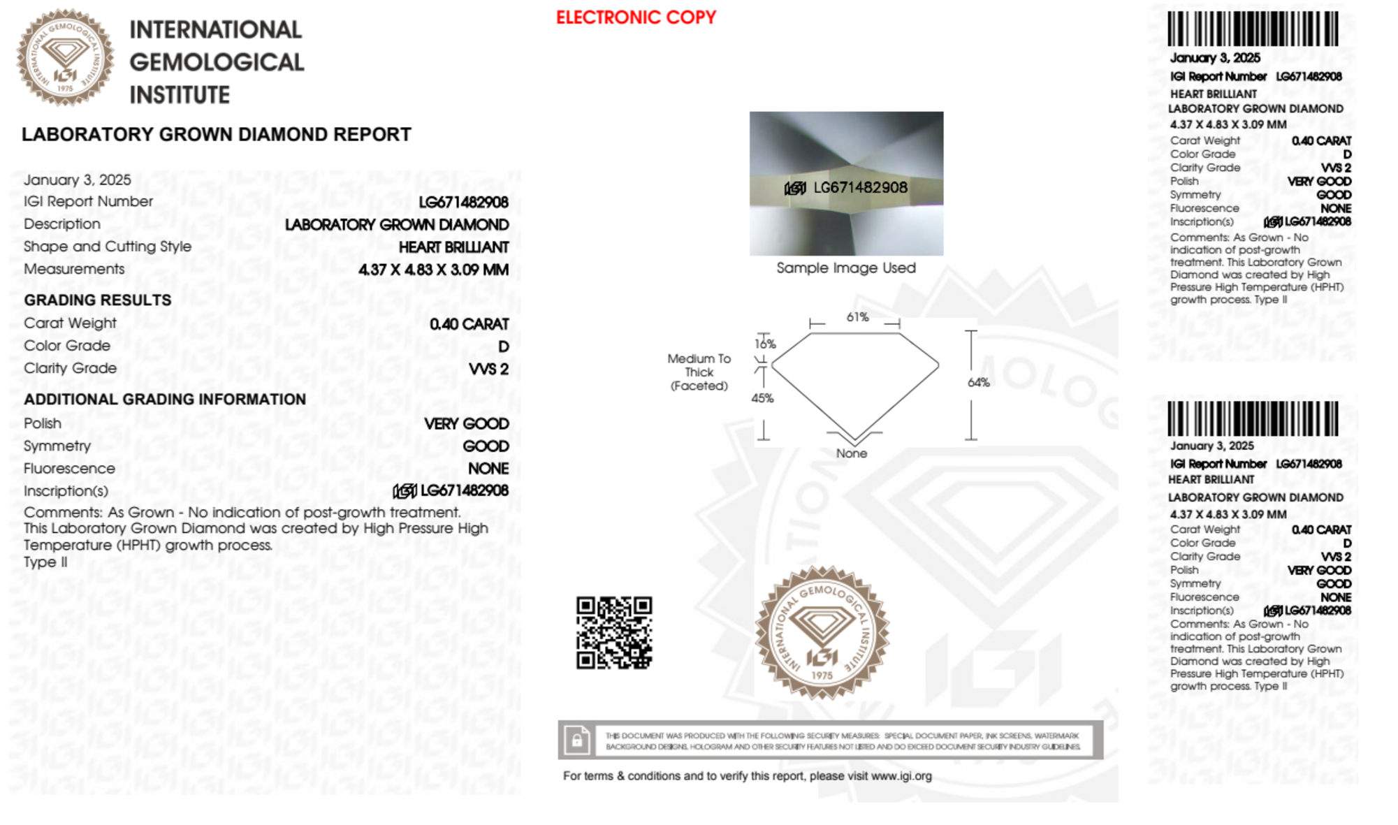 Your 0.40 carat Heart lab diamond is graded D color (Colorless), and you can read more about D color diamonds here.