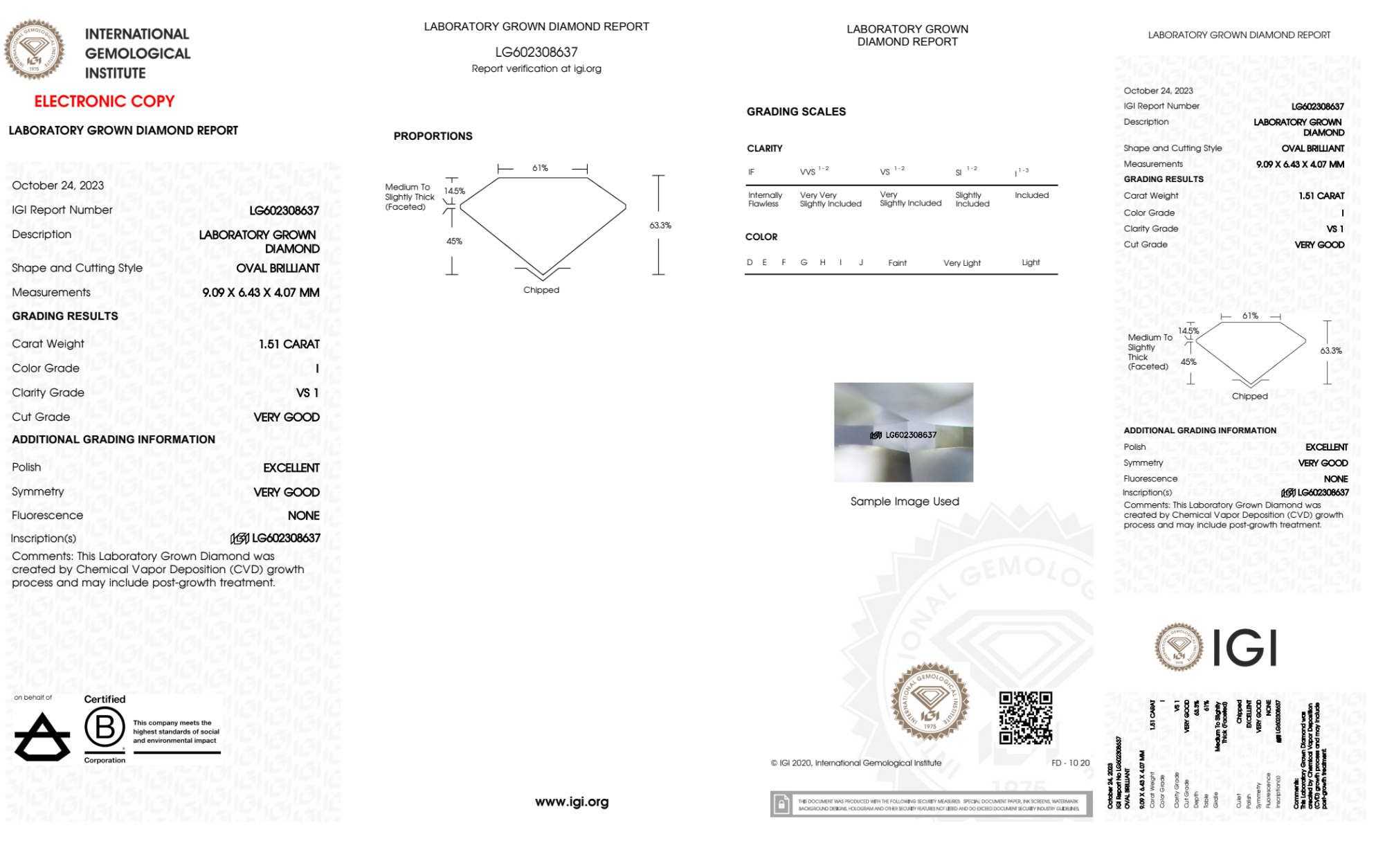 Your 1.51 carat Oval lab diamond is graded I color (Near Colorless), and you can read more about I color diamonds here.