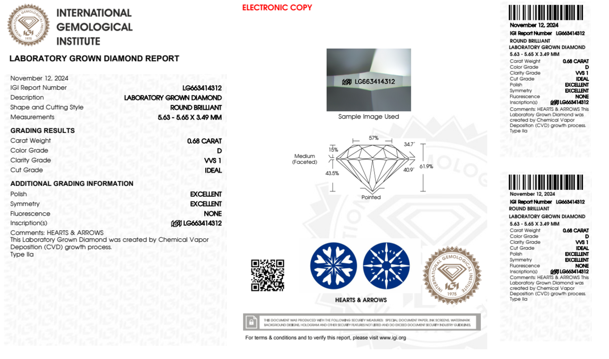 Your 0.68 carat Round lab diamond is graded D color (Colorless), and you can read more about D color diamonds here.