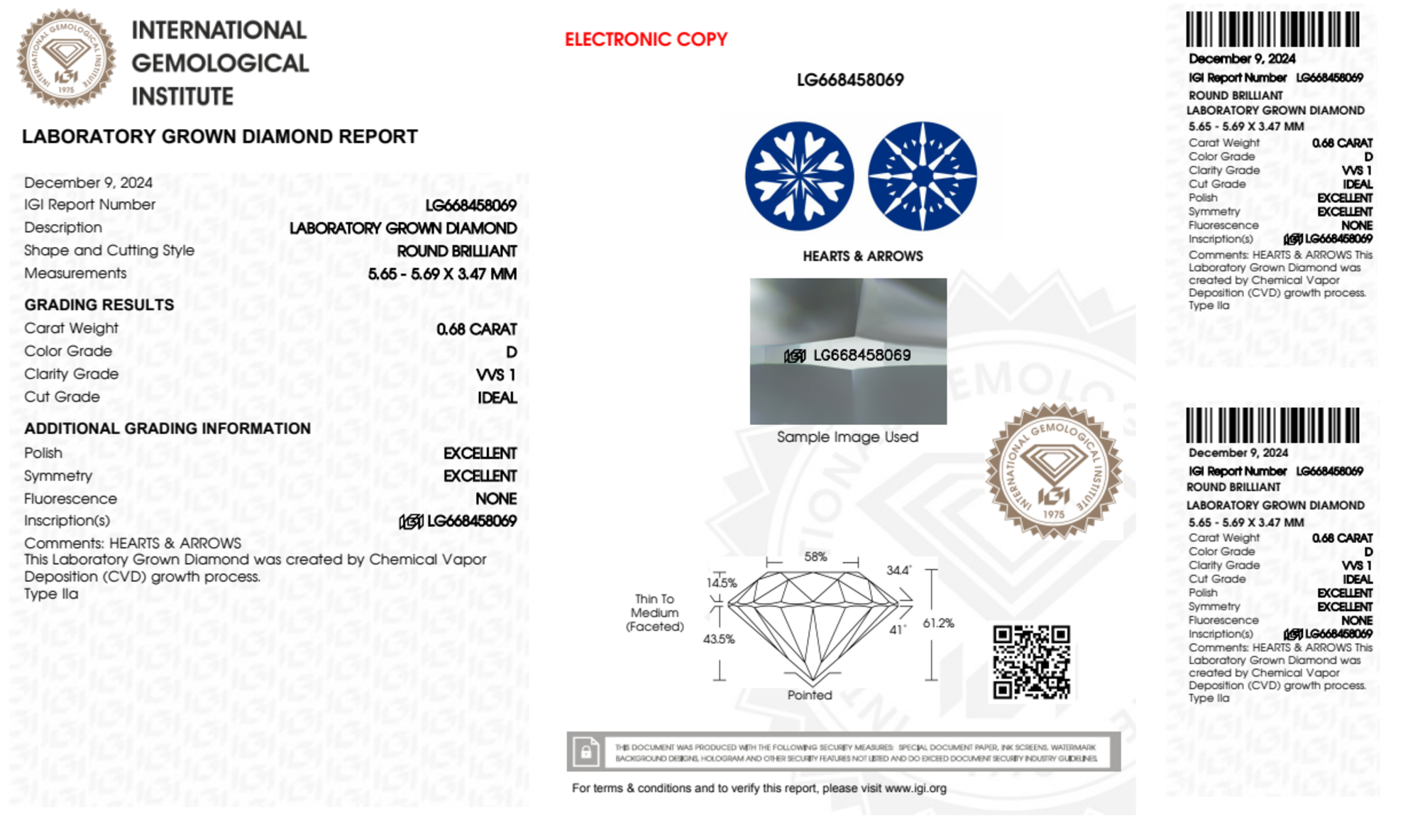 Your 0.68 carat Round lab diamond is graded VVS1 clarity, which stands for Very Very Slightly Included 1. Read more about VVS1 clarity diamonds here, or learn more about diamond clarity in general here.