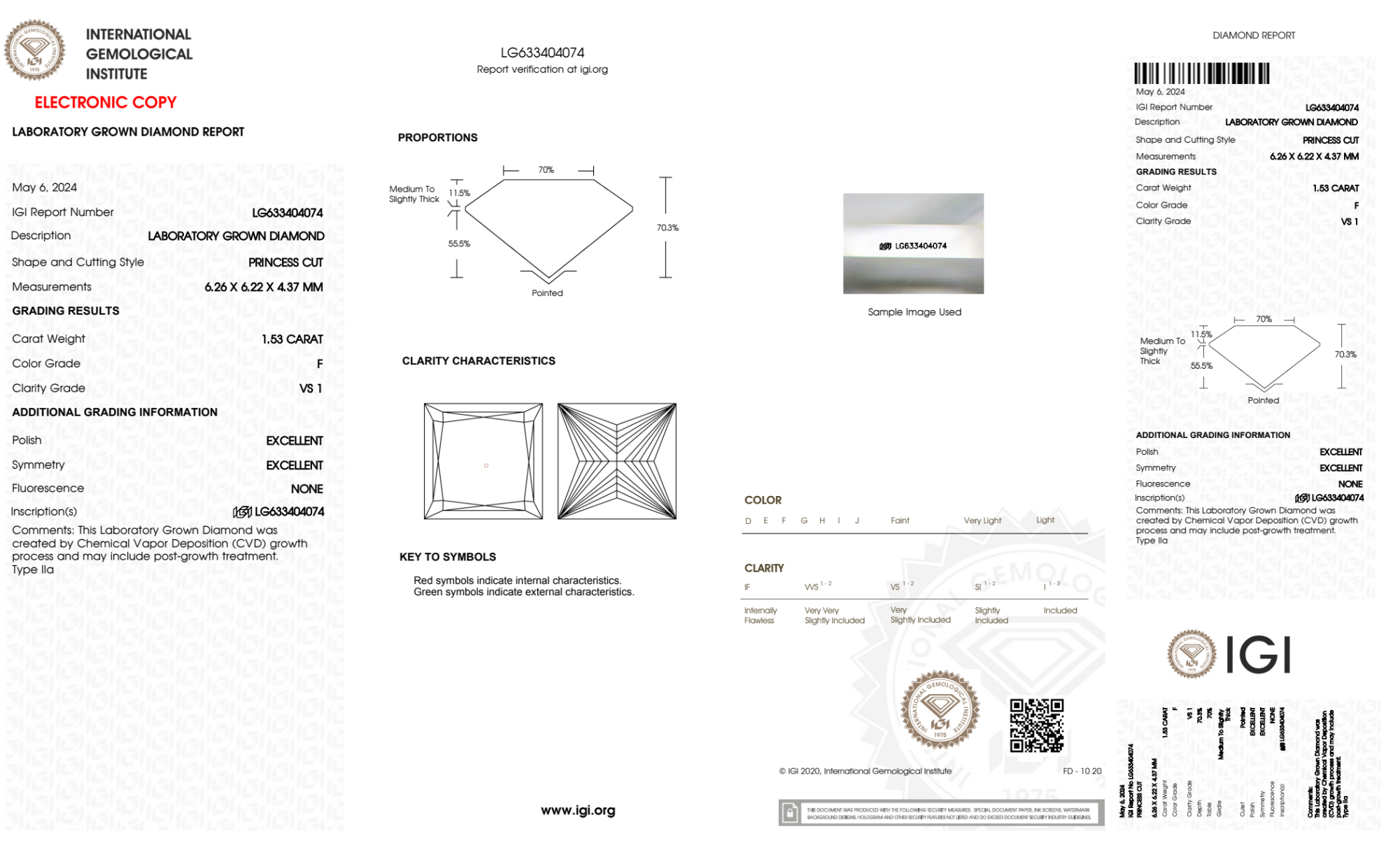 Your 1.53 carat Princess lab diamond is graded F color (Colorless), and you can read more about F color diamonds here.