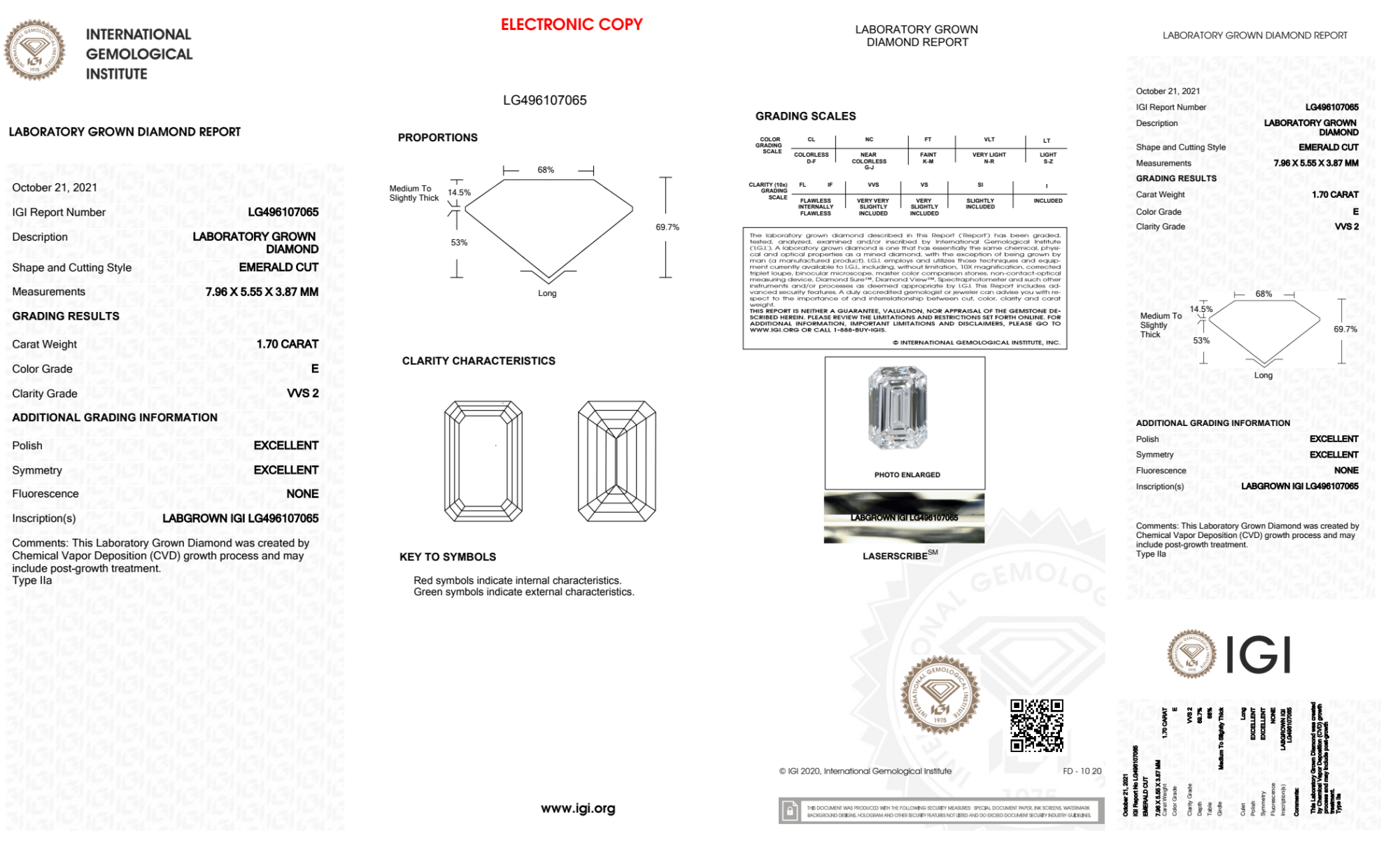 Your 1.70 carat Emerald lab diamond is graded E color (Colorless), and you can read more about E color diamonds here.