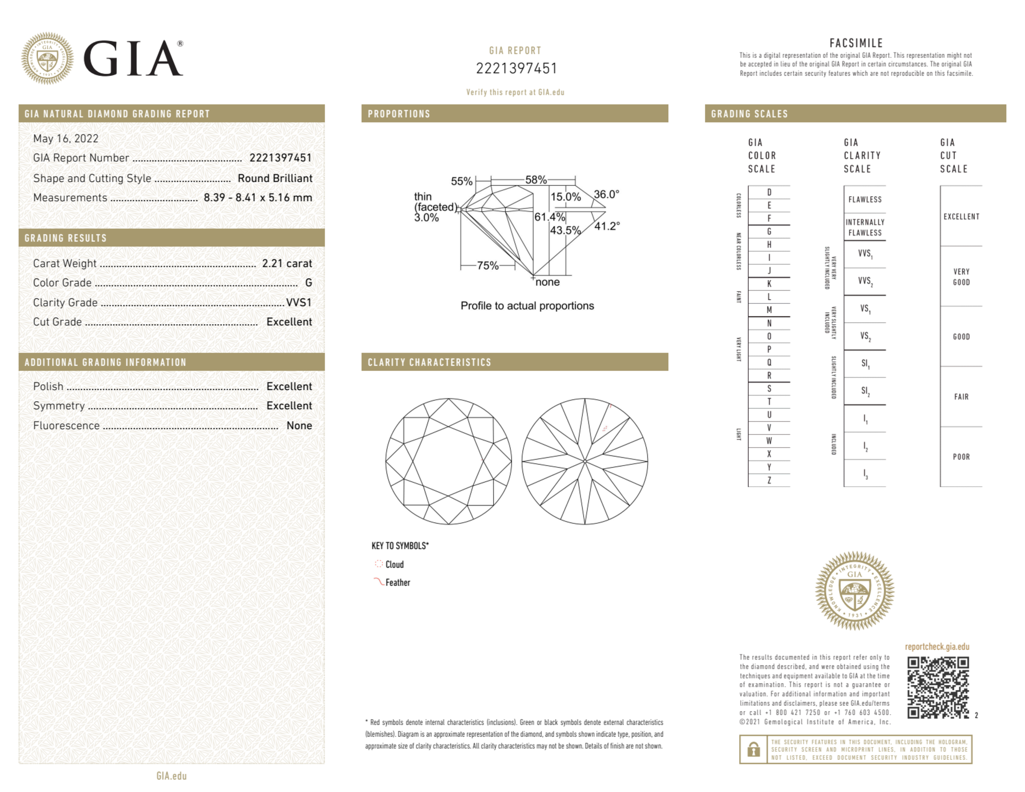 Your 2.21 carat Round natural diamond is graded VVS1 clarity, which stands for Very Very Slightly Included 1. Read more about VVS1 clarity diamonds here, or learn more about diamond clarity in general here.