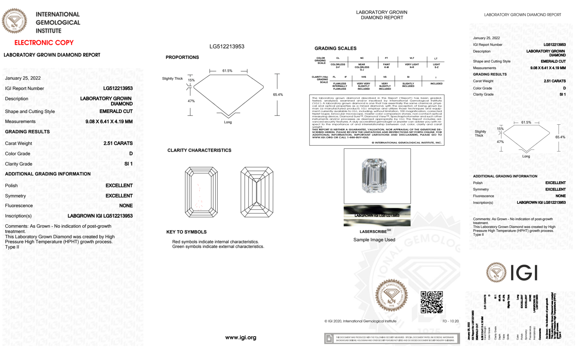 Your 2.51 carat Emerald lab diamond is graded SI1 clarity, which stands for Slightly Included 1. Read more about SI1 clarity diamonds here, or learn more about diamond clarity in general here.