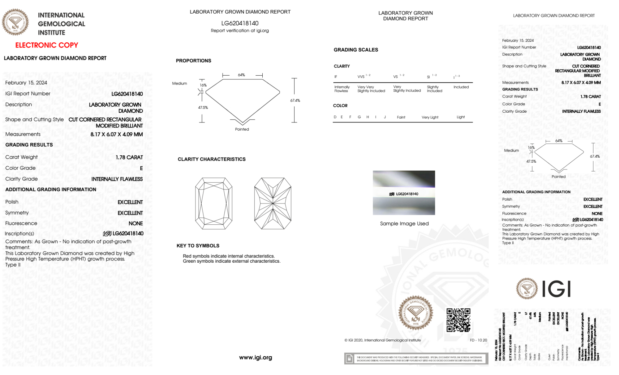 Your 1.78 carat Radiant lab diamond is graded E color (Colorless), and you can read more about E color diamonds here.