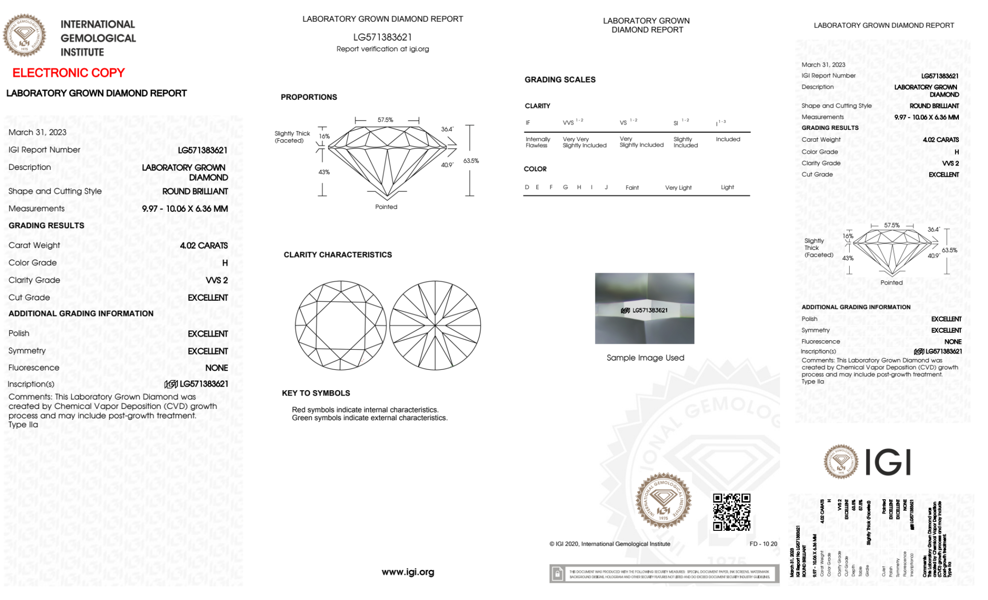 Your 4.02 carat Round lab diamond is graded H color (Near Colorless), and you can read more about H color diamonds here.