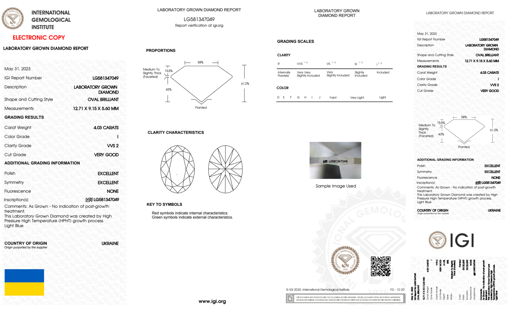 Your 4.03 carat Oval lab diamond is graded I color (Near Colorless), and you can read more about I color diamonds here.