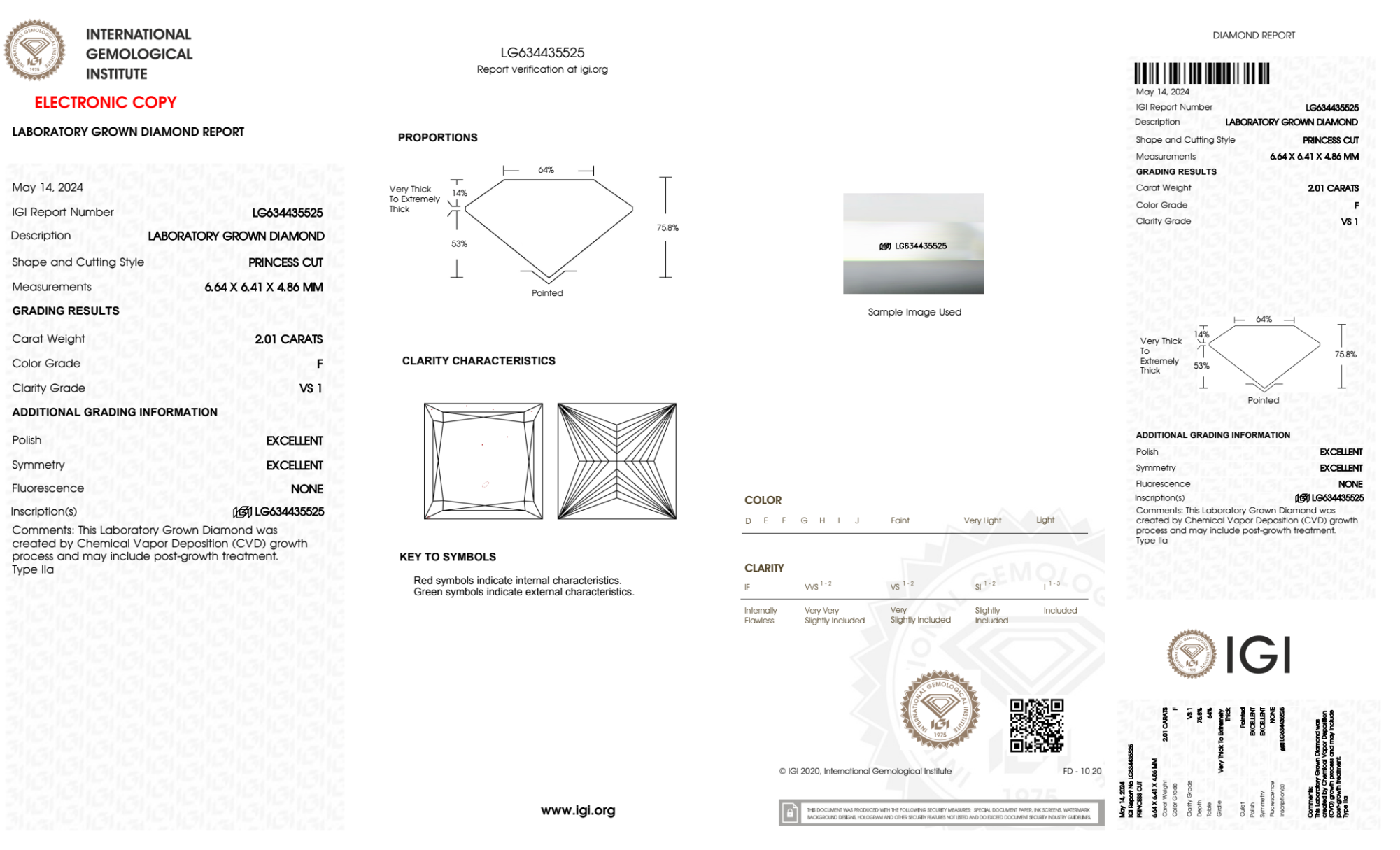 Your 2.01 carat Princess lab diamond is graded F color (Colorless), and you can read more about F color diamonds here.