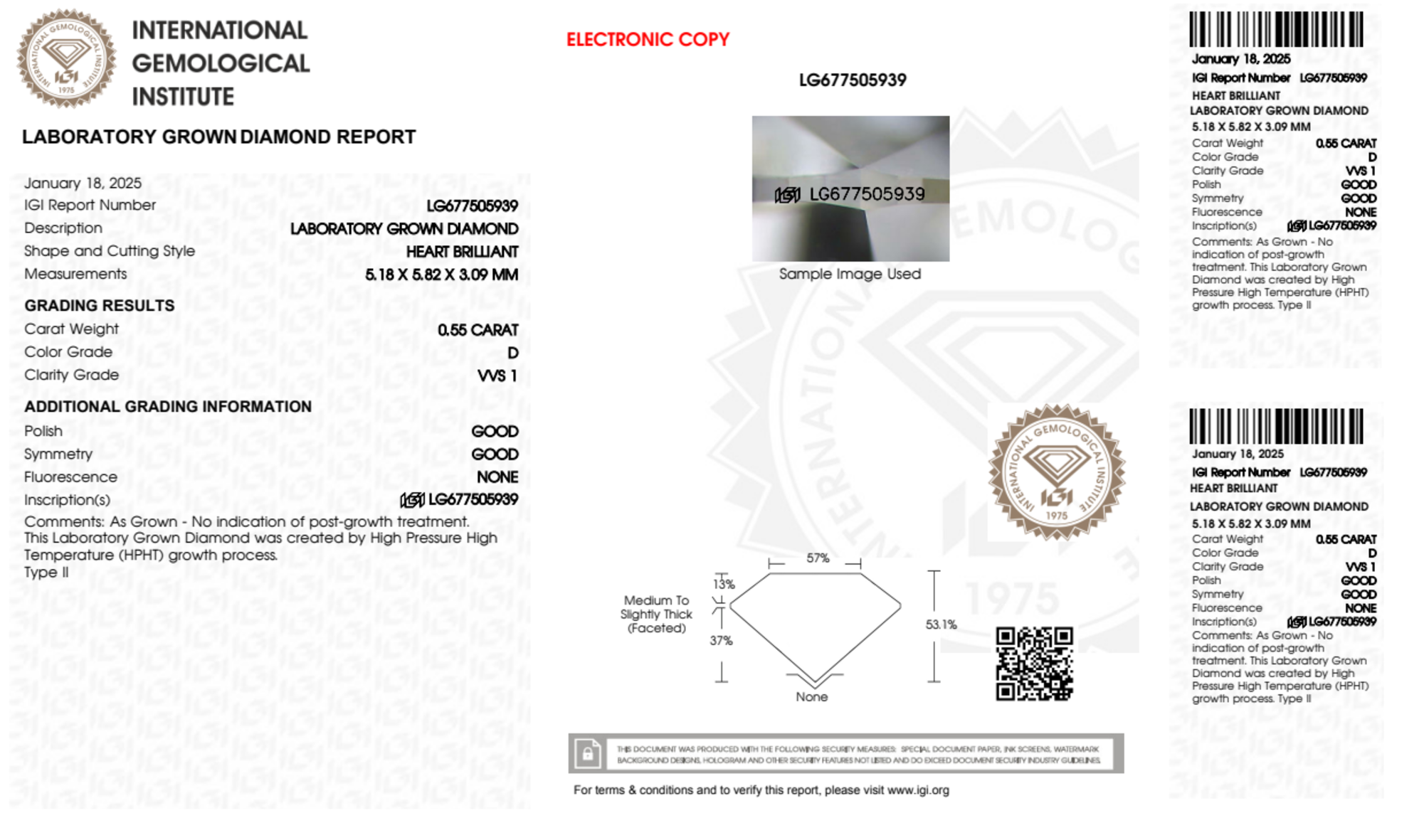 Your 0.55 carat Heart lab diamond is graded D color (Colorless), and you can read more about D color diamonds here.