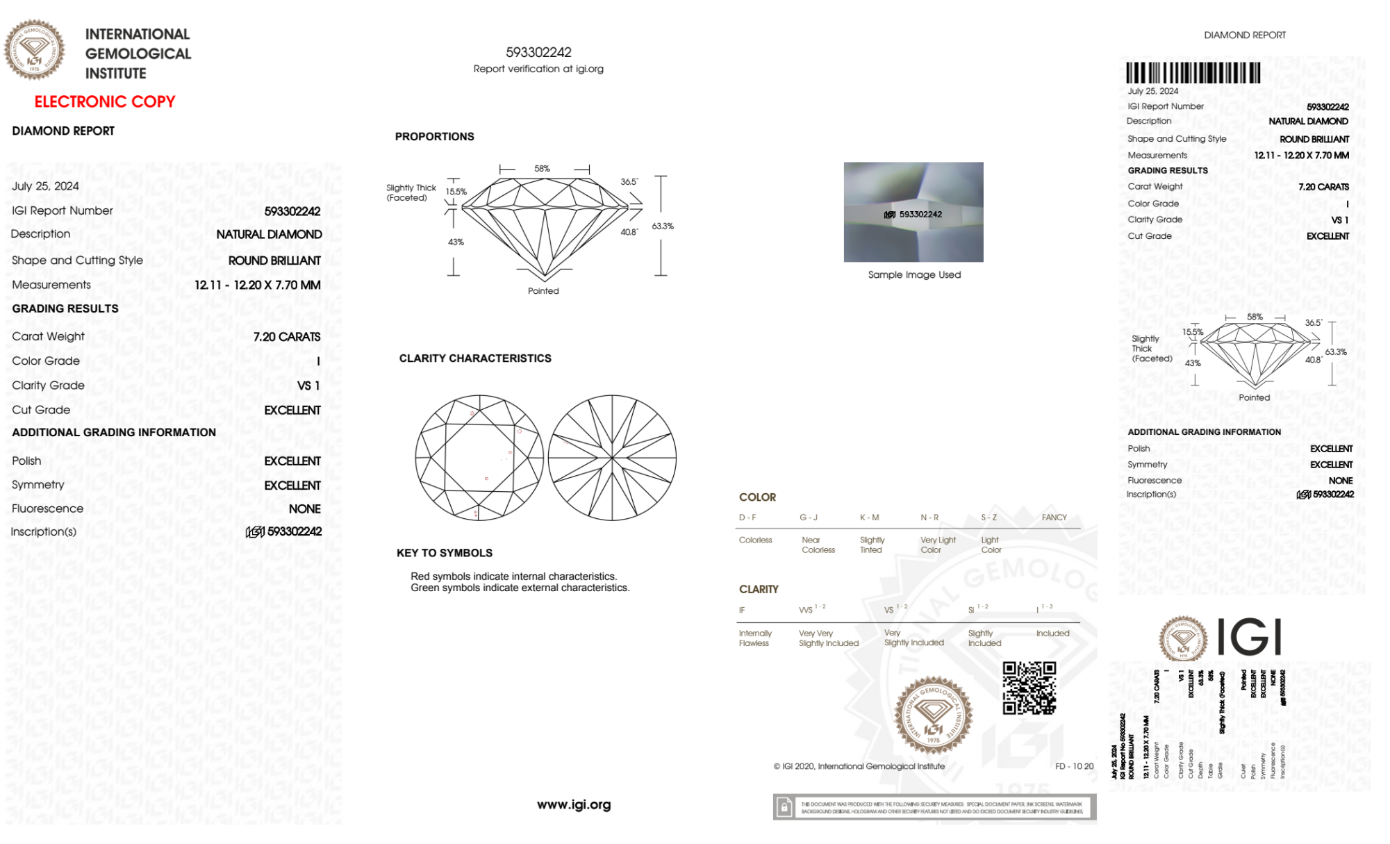 Your 7.20 carat Round natural diamond is graded VS1 clarity, which stands for Very Slightly Included 1. Read more about VS1 clarity diamonds here, or learn more about diamond clarity in general here.