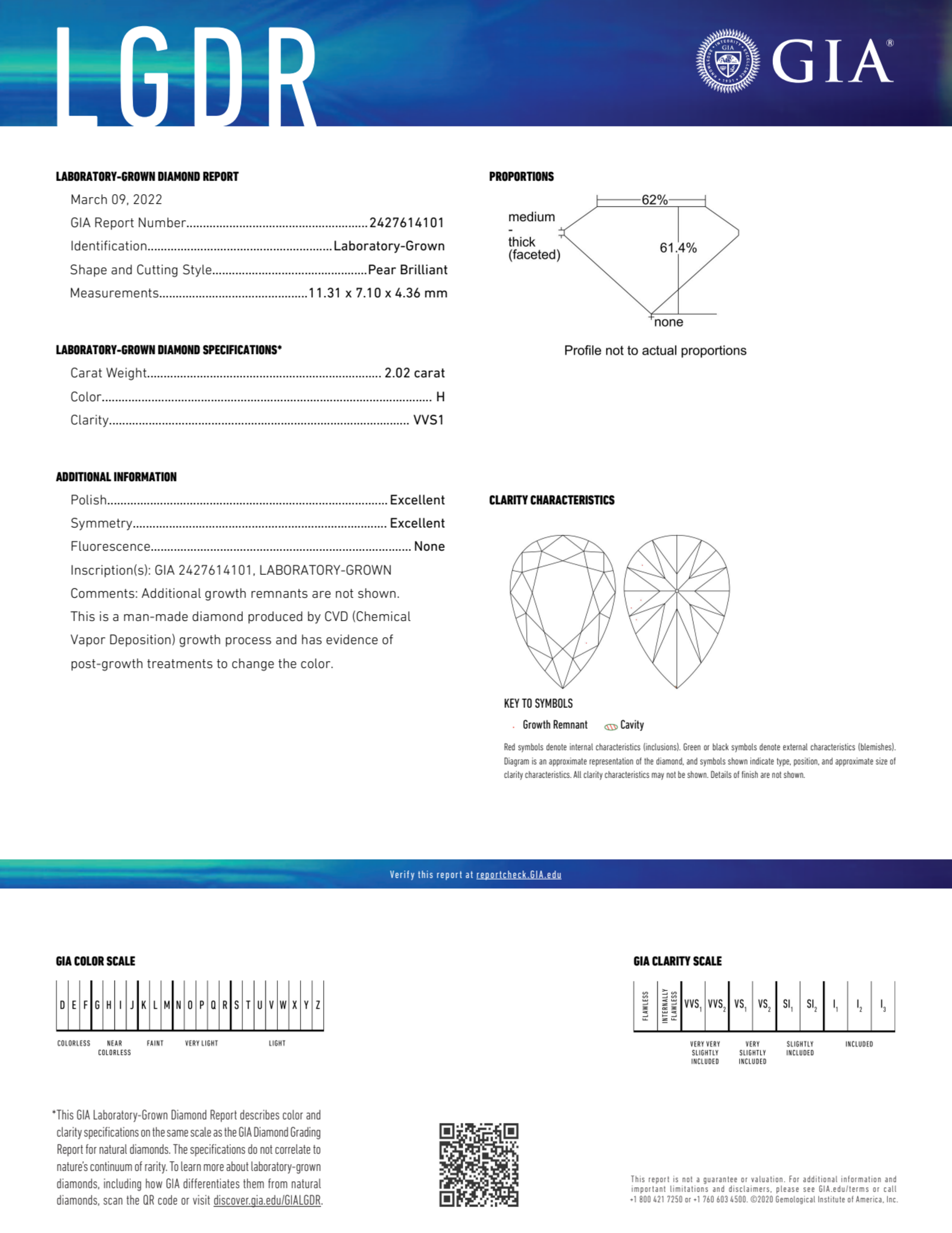 Your 2.02 carat Pear lab diamond is graded H color (Near Colorless), and you can read more about H color diamonds here.