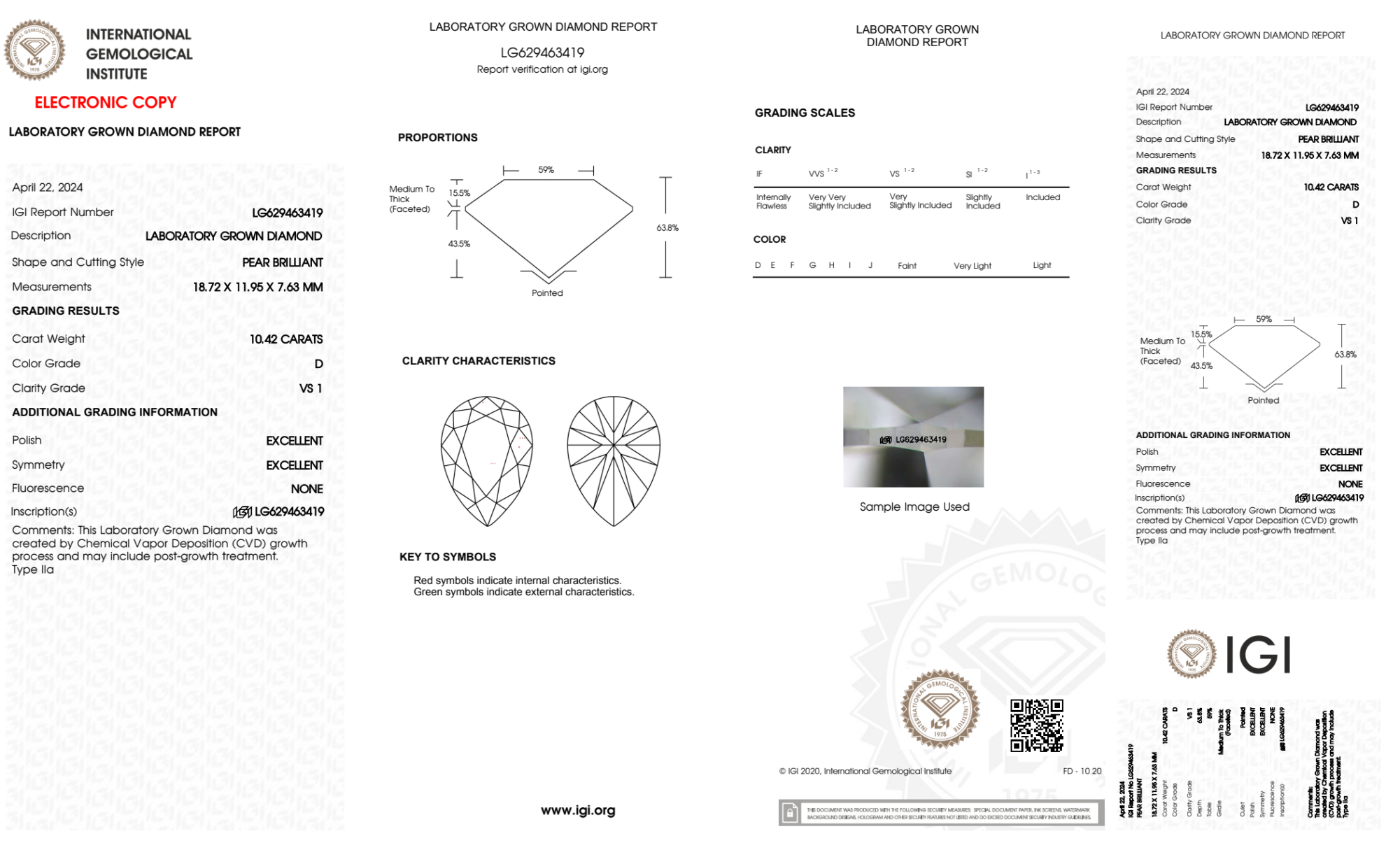 Your 10.42 carat Pear lab diamond is graded D color (Colorless), and you can read more about D color diamonds here.